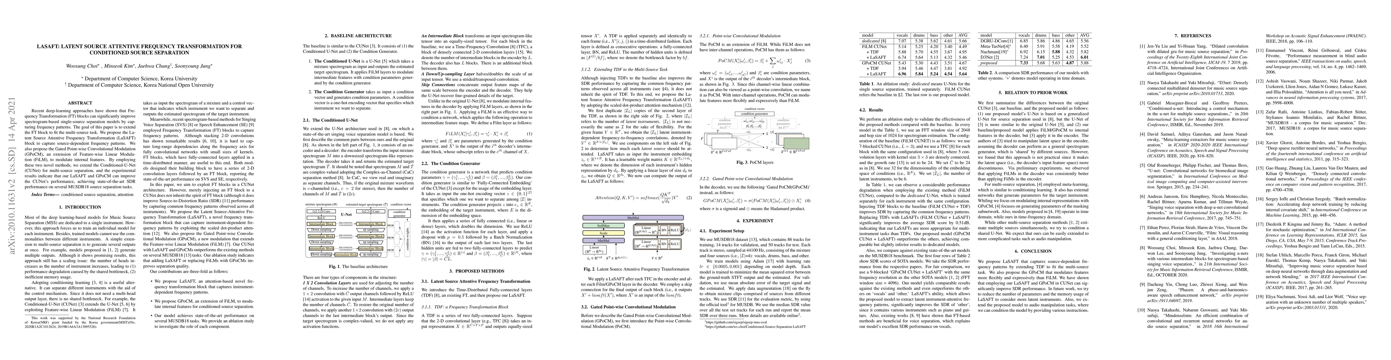 This paper introduces the Latent Source Attentive Frequency Transformation (LaSAFT) block and Gated Point-wise Convolutional Modulation (GPoCM) to enhance multi-source separation in deep learning models. The proposed methods improve the Conditioned-U-Net (CUNet), achieving state-of-the-art Source-to-Distortion Ratio (SDR) on MUSDB18 datasets.