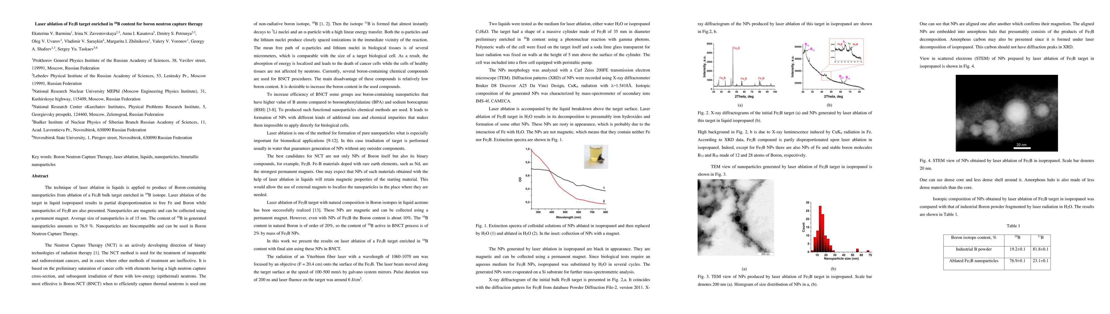 The technique of laser ablation in liquids is applied to produce of Boron-containing nanoparticles from ablation of a Fe$_2$B bulk target enriched in 10B isotope. Laser ablation of the target in liquid isopropanol results in partial disproportionation to free Fe and Boron while nanoparticles of Fe$_2$B are also presented. Nanoparticles are magnetic and can be collected using a permanent magnet. Average size of nanoparticles is of 15 nm. The content of 10B in generated nanoparticles amounts to 76,9 %. Nanoparticles are biocompatible and can be used in Boron Neutron Capture Therapy.
