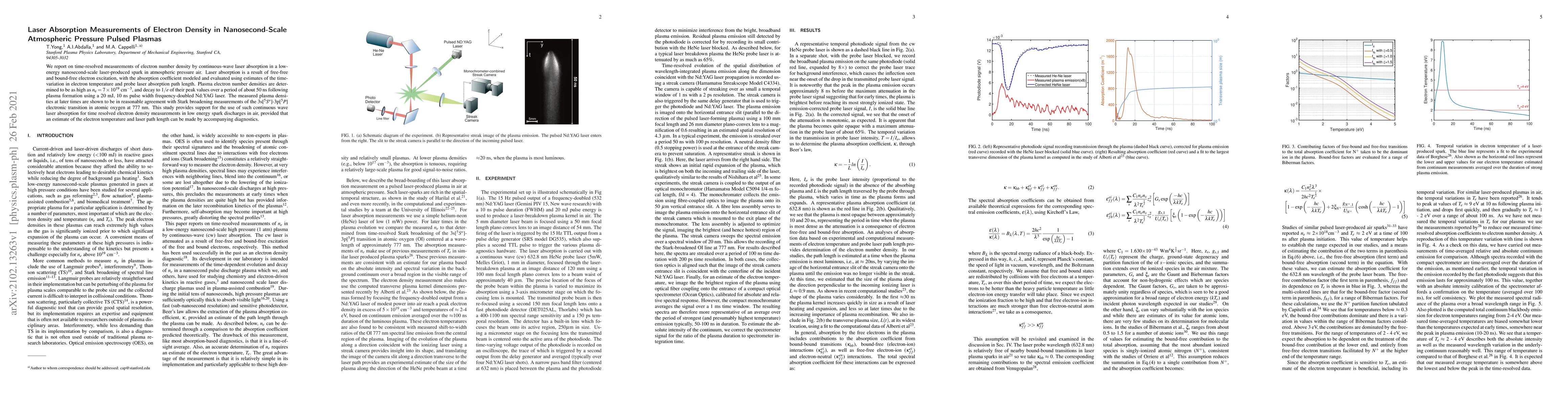 This study measures electron number density in nanosecond-scale atmospheric pressure plasmas using continuous-wave laser absorption, finding peak densities of $n_\text{e}=7\times10^{19}$ cm$^{-3}$ that decay over 50 ns. The method shows agreement with Stark broadening measurements, supporting its use for time-resolved density measurements in low-energy spark discharges.