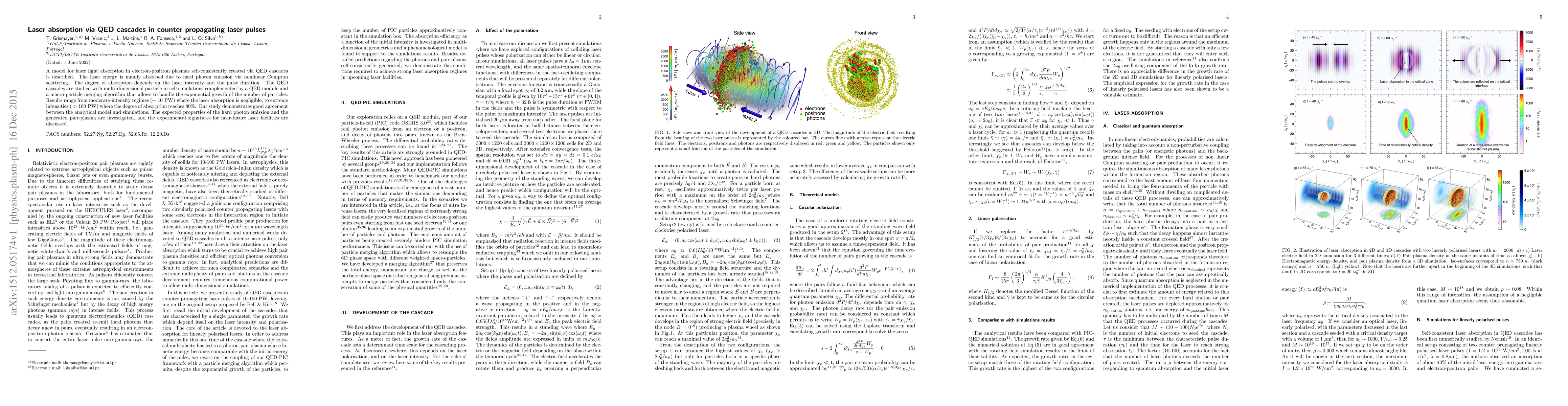 This paper models laser absorption in electron-positron plasmas generated by QED cascades, showing that absorption is mainly due to nonlinear Compton scattering. Results from simulations indicate negligible absorption at moderate intensities but up to 80% absorption at extreme intensities, with good agreement between analytical models and simulations.