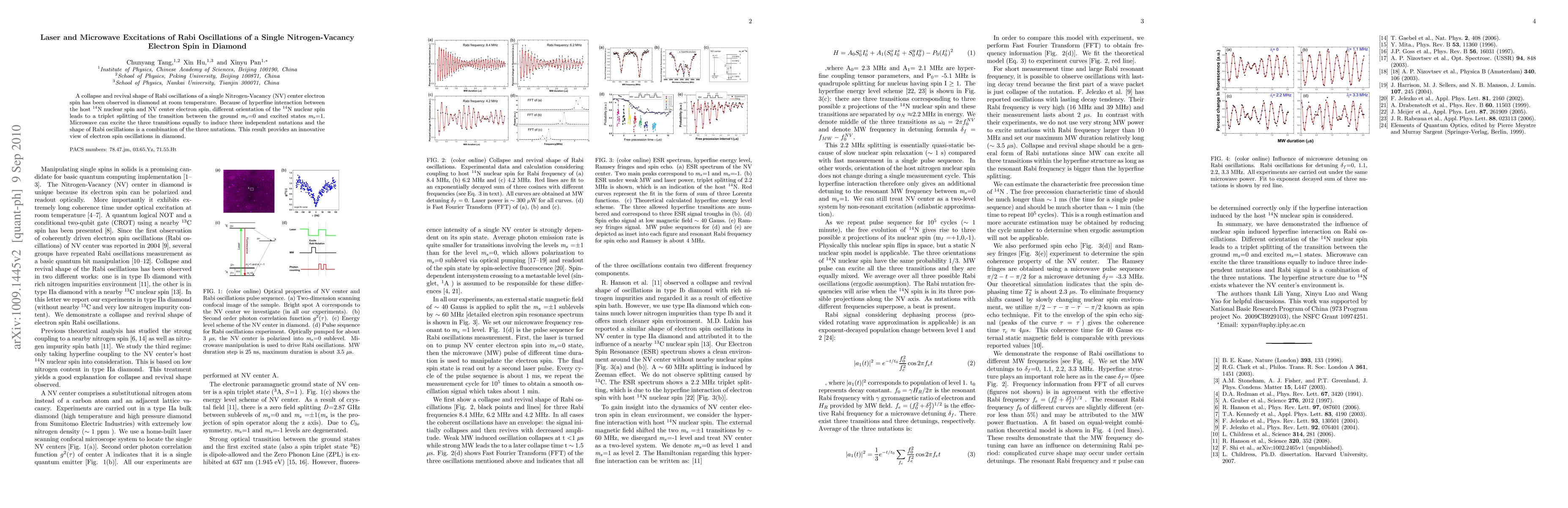 A collapse and revival shape of Rabi oscillations of a single Nitrogen-Vacancy (NV) center electron spin has been observed in diamond at room temperature. Because of hyperfine interaction between the host 14N nuclear spin and NV center electron spin, different orientation of the 14N nuclear spin leads to a triplet splitting of the transition between the ground ms=0 and excited states ms=1. Microwave can excite the three transitions equally to induce three independent nutations and the shape of Rabi oscillations is a combination of the three nutations. This result provides an innovative view of electron spin oscillations in diamond.