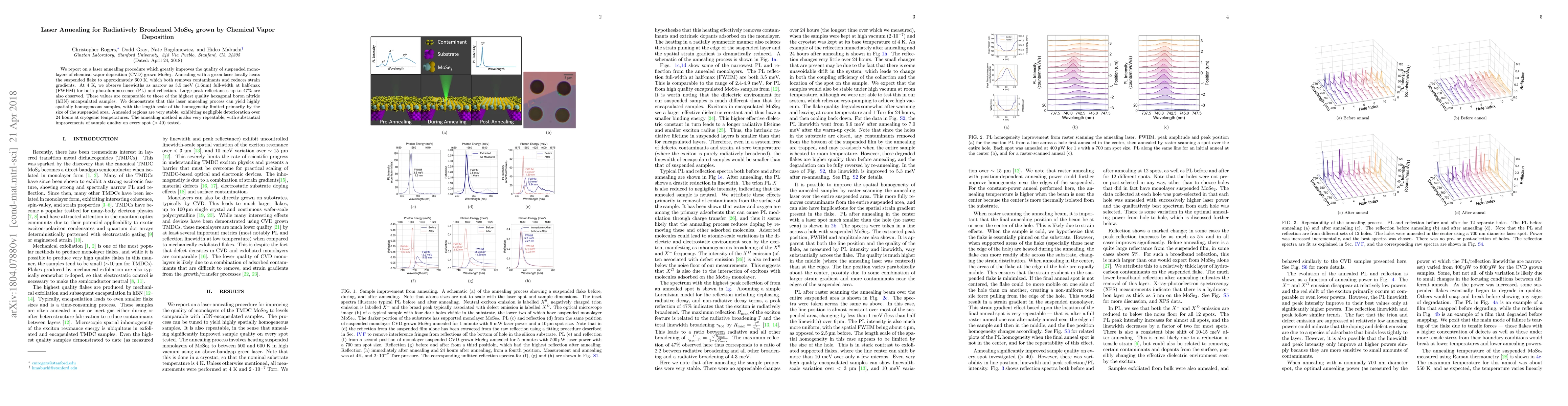We report on a laser annealing procedure which greatly improves the quality of suspended monolayers of chemical vapor deposition (CVD) grown MoSe2. Annealing with a green laser locally heats the suspended flake to approximately 600 K, which both removes contaminants and reduces strain gradients. At 4 K, we observe linewidths as narrow as 3.5 meV (1.6nm) full-width at half-max (FWHM) for both photoluminescence (PL) and reflection. Large peak reflectances up to 47% are also observed. These values are comparable to those of the highest quality hexagonal boron nitride (hBN) encapsulated samples. We demonstrate that this laser annealing process can yield highly spatially homogeneous samples, with the length scale of the homogeneity limited primarily by the size of the suspended area. Annealed regions are very stable, exhibiting negligible deterioration over 24 hours at cryogenic temperatures. The annealing method is also very repeatable, with substantial improvements of sample quality on every spot (> 40) tested.
