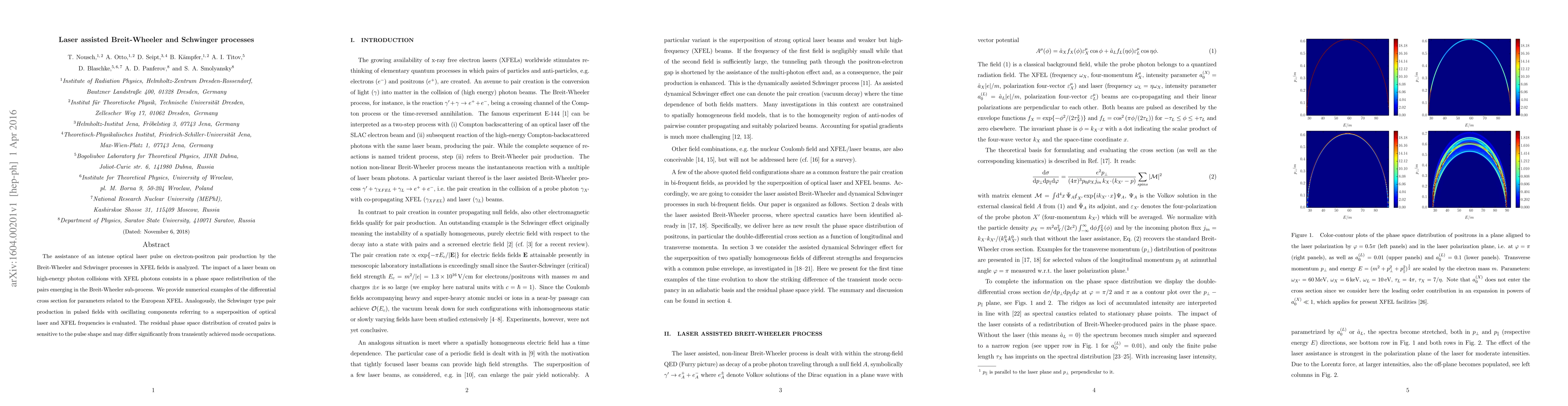 This paper analyzes how an intense optical laser pulse influences electron-positron pair production via the Breit-Wheeler and Schwinger processes in XFEL fields, showing that the laser alters the phase space distribution of the pairs. Numerical examples are provided for parameters relevant to the European XFEL, highlighting the sensitivity of the residual phase space distribution to the laser pulse shape.
