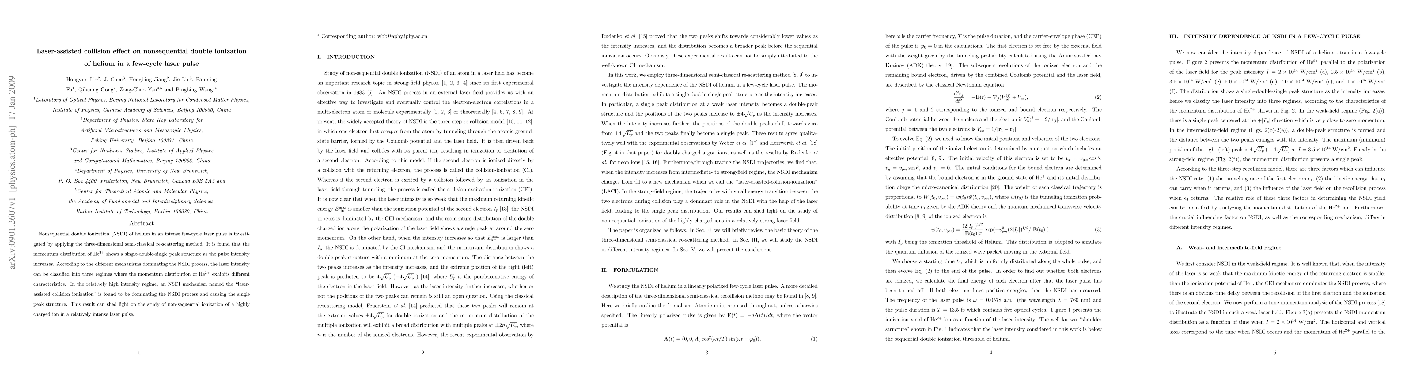 Summary: This study investigates nonsequential double ionization (NSDI) of helium using intense few-cycle laser pulses, revealing distinct momentum distributions of He$^{2+}$ in different intensity regimes. The "laser-assisted collision ionization" mechanism dominates at high intensities, forming a single-double-single peak structure and providing insights into highly charged ion ionization processes.