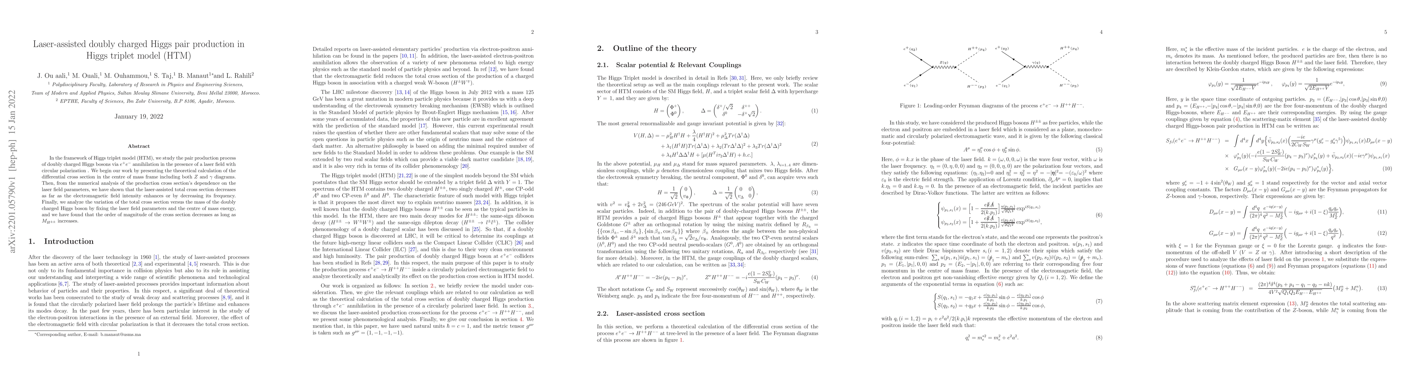 This paper investigates laser-assisted production of doubly charged Higgs pairs in the Higgs triplet model via $e^{+}e^{-}$ annihilation, calculating the differential cross section. It finds that the total cross section decreases with higher electromagnetic field intensity and lower frequency, and decreases with increasing mass of the doubly charged Higgs boson.