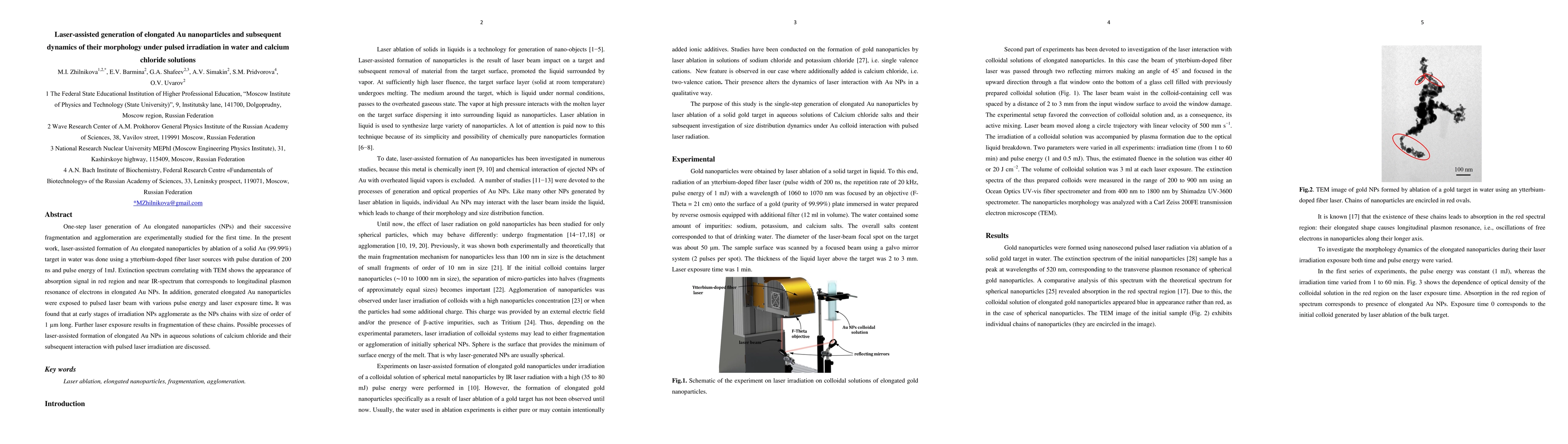 This paper investigates the laser-assisted generation of elongated Au nanoparticles via ablation in water and their dynamic morphological changes under pulsed irradiation. The study reveals initial agglomeration followed by fragmentation of these nanoparticles under varying laser exposure conditions.