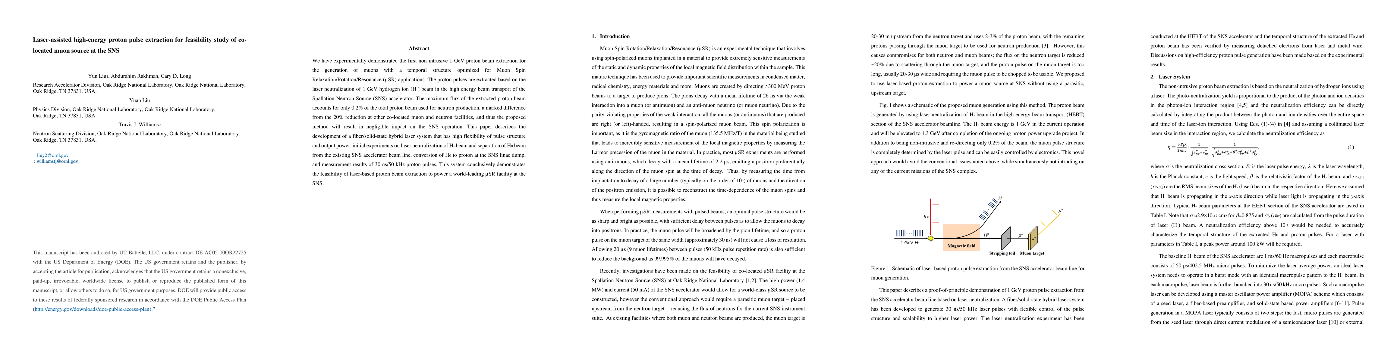 This paper demonstrates a non-intrusive method for extracting 1-GeV proton pulses from the SNS accelerator, using laser neutralization of hydrogen ion beams, with minimal impact on neutron production. The developed hybrid laser system enables flexible pulse structures and power, showing the feasibility of co-locating a muon source for MuSR applications.