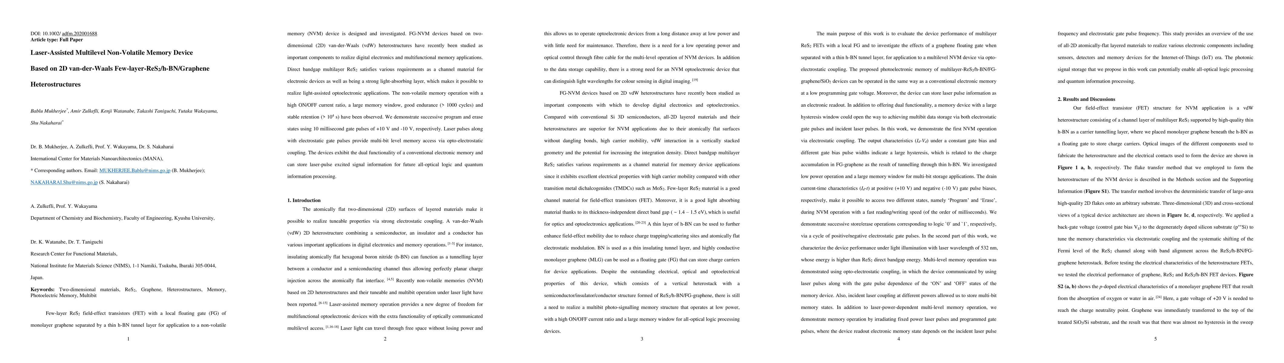 This research paper presents a laser-assisted multilevel non-volatile memory device based on 2D van-der-Waals heterostructures composed of few-layer ReS2, h-BN, and graphene. The device shows promising non-volatile memory performance with high ON/OFF current ratios, endurance, and retention, alongside optoelectronic functionalities for potential all-optical logic and quantum information processing.