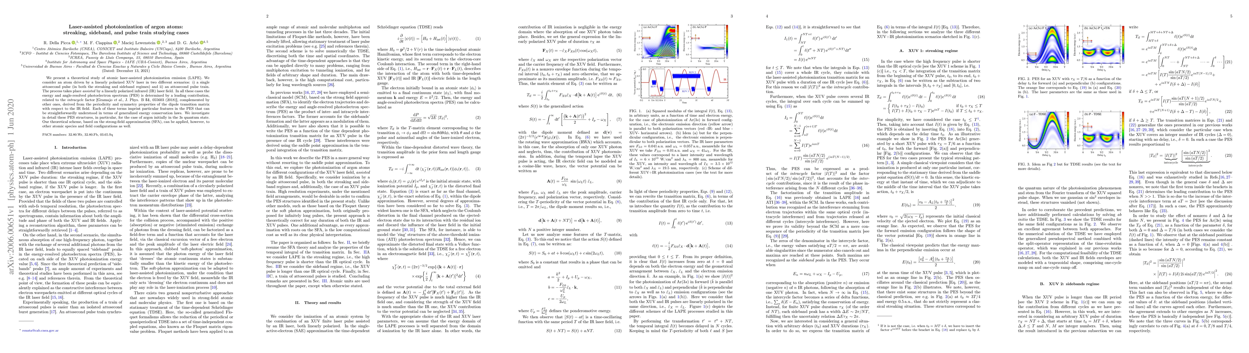 This paper presents a theoretical study of laser-assisted photoionization emission (LAPE) of argon atoms driven by XUV lasers, analyzing both single attosecond pulses and pulse trains in the presence of an infrared laser field. The study reveals distinct features in the energy and angle-resolved photoelectron spectrum, explained through generalized energy conservation laws and the strong-field approximation.