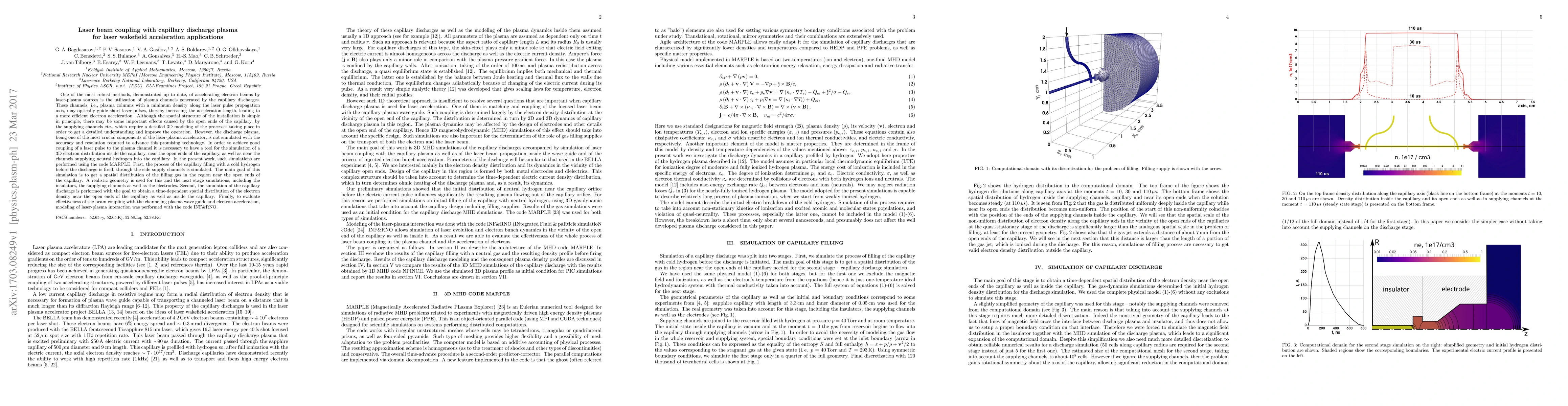 One of the most robust methods, demonstrated up to date, of accelerating electron beams by laser-plasma sources is the utilization of plasma channels generated by the capillary discharges. These channels, i.e., plasma columns with a minimum density along the laser pulse propagation axis, may optically guide short laser pulses, thereby increasing the acceleration length, leading to a more efficient electron acceleration. Although the spatial structure of the installation is simple in principle, there may be some important effects caused by the open ends of the capillary, by the supplying channels etc., which require a detailed 3D modeling of the processes taking place in order to get a detailed understanding and improve the operation. However, the discharge plasma, being one of the most crucial components of the laser-plasma accelerator, is not simulated with the accuracy and resolution required to advance this promising technology. In the present work, such simulations are performed using the code MARPLE. First, the process of the capillary filling with a cold hydrogen before the discharge is fired, through the side supply channels is simulated. The main goal of this simulation is to get a spatial distribution of the filling gas in the region near the open ends of the capillary. A realistic geometry is used for this and the next stage simulations, including the insulators, the supplying channels as well as the electrodes. Second, the simulation of the capillary discharge is performed with the goal to obtain a time-dependent spatial distribution of the electron density near the open ends of the capillary as well as inside the capillary. Finally, to evaluate effectiveness of the beam coupling with the channeling plasma wave guide and electron acceleration, modeling of laser-plasma interaction was performed with the code INF&RNO