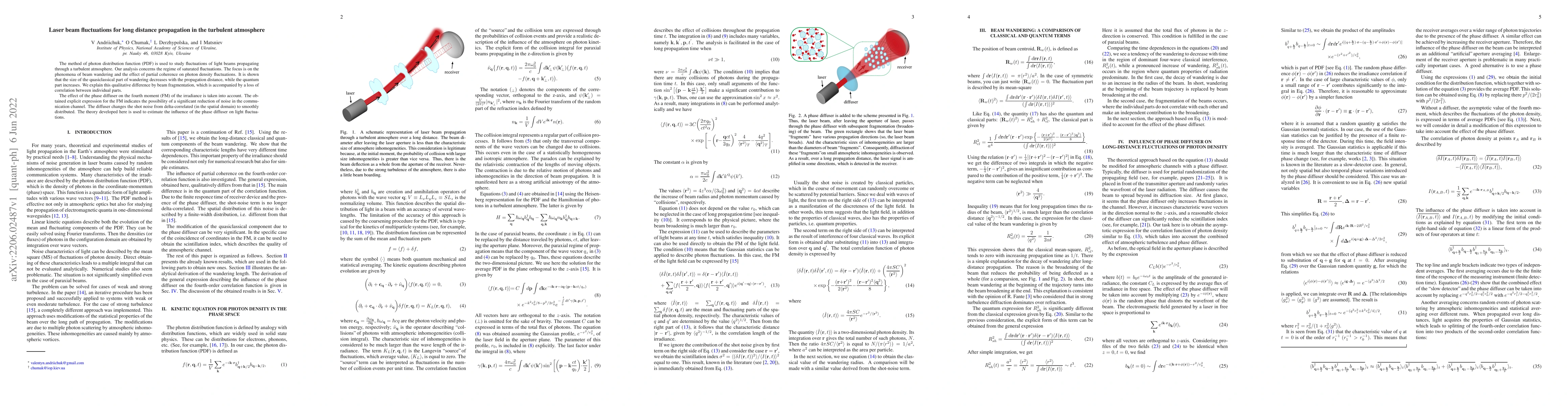 The method of photon distribution function (PDF) is used to study fluctuations of light beams propagating through a turbulent atmosphere. Our analysis concerns the regime of saturated fluctuations. The focus is on the phenomena of beam wandering and the effect of partial coherence on photon density fluctuations. It is shown that the size of the quasiclassical part of wandering decreases with the propagation distance, while the quantum part increases. We explain this qualitative difference by beam fragmentation, which is accompanied by a loss of correlation between individual parts. The effect of the phase diffuser on the fourth moment (FM) of the irradiance is taken into account. The obtained explicit expression for the FM indicates the possibility of a significant reduction of noise in the communication channel. The diffuser changes the shot noise from delta-correlated (in the spatial domain) to smoothly distributed. The theory developed here is used to estimate the influence of the phase diffuser on light fluctuations.