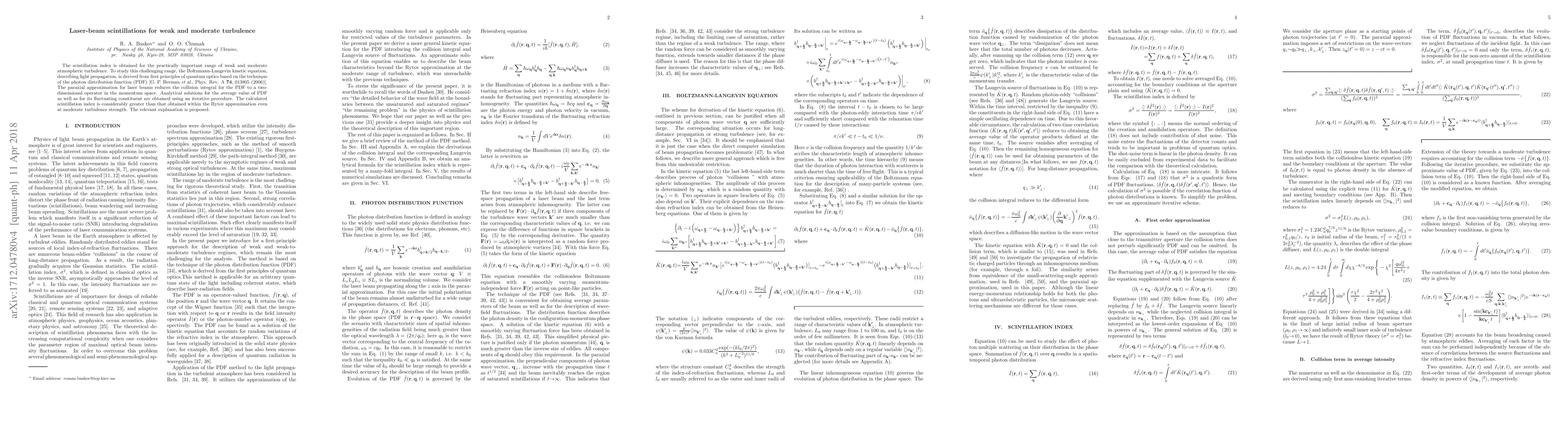 The scintillation index is obtained for the practically important range of weak and moderate atmospheric turbulence. To study this challenging range, the Boltzman-Langevin kinetic equation, describing light propagation, is derived from first principles of quantum optics based on the technique of the photon distribution function (PDF) [G. P. Berman et al., Phys. Rev. A 74, 013805 (2006)]. The paraxial approximation for laser beams reduces the collision integral for the PDF to a two-dimensional operator in the momentum space. Analytical solutions for the average value of PDF as well as for its fluctuating constituent are obtained using an iterative procedure. The calculated scintillation index is considerably greater than that obtained within the Rytov approximation even at moderate turbulence strength. The relevant explanation is proposed.