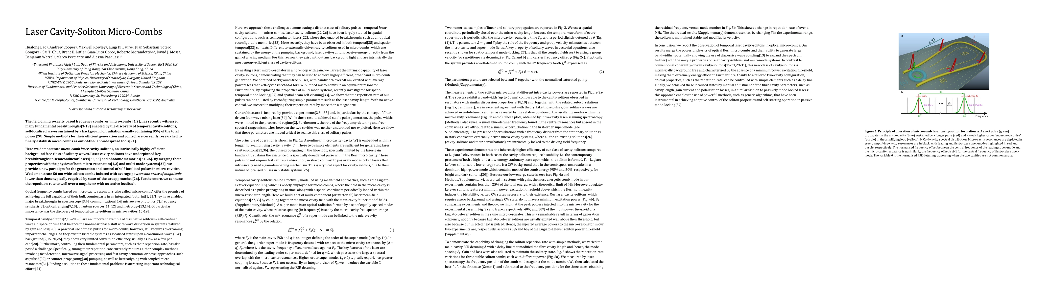 The field of micro-cavity based frequency combs, or 'micro-combs'[1,2], has recently witnessed many fundamental breakthroughs[3-19] enabled by the discovery of temporal cavity-solitons, self-localised waves sustained by a background of radiation usually containing 95% of the total power[20]. Simple methods for their efficient generation and control are currently researched to finally establish micro-combs as out-of-the-lab widespread tools[21]. Here we demonstrate micro-comb laser cavity-solitons, an intrinsically highly-efficient, background free class of solitary waves. Laser cavity-solitons have underpinned key breakthroughs in semiconductor lasers[22,23] and photonic memories[24-26]. By merging their properties with the physics of both micro-resonators[1,2] and multi-mode systems[27], we provide a new paradigm for the generation and control of self-localised pulses in micro-cavities. We demonstrate 50 nm wide soliton combs induced with average powers one order of magnitude lower than those typically required by state-of-the-art approaches[26]. Furthermore, we can tune the repetition-rate to well over a megahertz with no-active feedback.