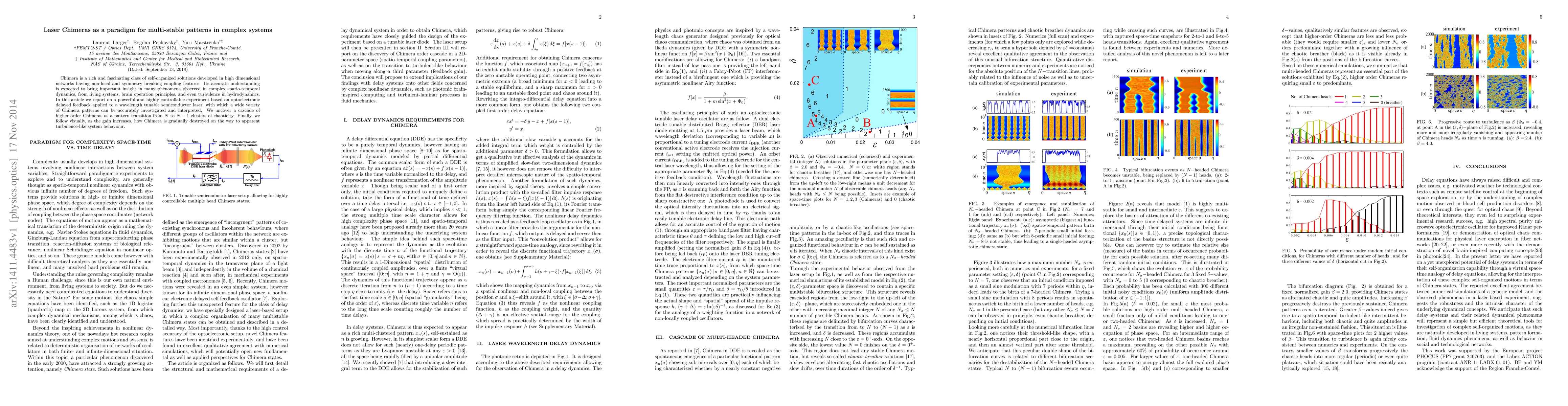 Chimera is a rich and fascinating class of self-organized solutions developed in high dimensional networks having non-local and symmetry breaking coupling features. Its accurate understanding is expected to bring important insight in many phenomena observed in complex spatio-temporal dynamics, from living systems, brain operation principles, and even turbulence in hydrodynamics. In this article we report on a powerful and highly controllable experiment based on optoelectronic delayed feedback applied to a wavelength tunable semiconductor laser, with which a wide variety of Chimera patterns can be accurately investigated and interpreted. We uncover a cascade of higher order Chimeras as a pattern transition from N to N - 1 clusters of chaoticity. Finally, we follow visually, as the gain increases, how Chimera is gradually destroyed on the way to apparent turbulence-like system behaviour.