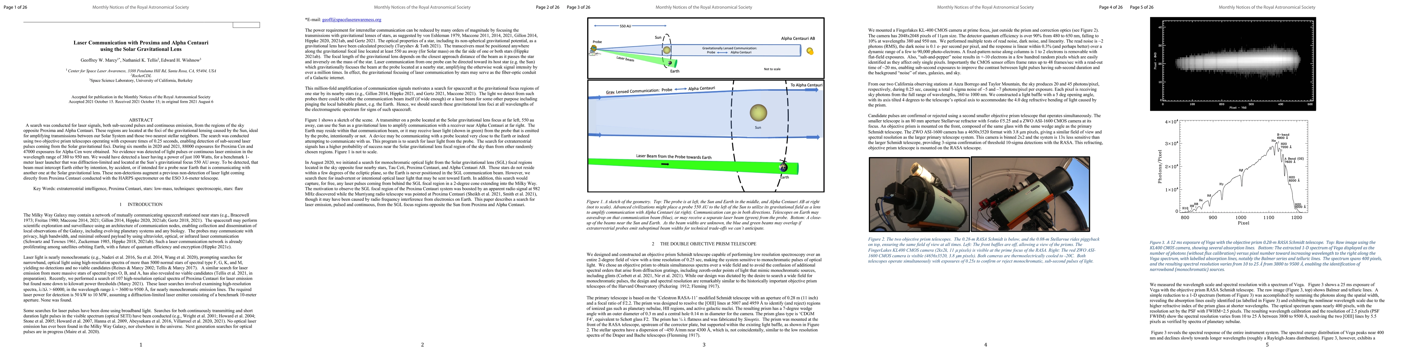 This study searched for laser signals from Proxima and Alpha Centauri using the Sun's gravitational lens to amplify the transmissions. Despite 88,000 exposures for Proxima and 47,000 for Alpha Centauri, no laser signals were detected, indicating no laser emissions above 100 Watts.