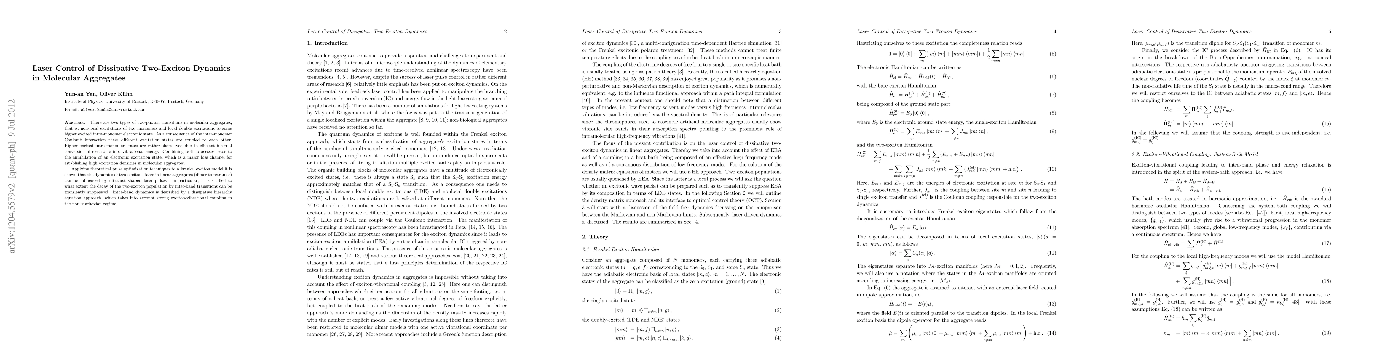 This paper explores the control of dissipative two-exciton dynamics in molecular aggregates using ultrafast shaped laser pulses, demonstrating how these pulses can suppress the decay of two-exciton populations through inter-band transitions, while accounting for strong exciton-vibrational coupling in a non-Markovian regime. Theoretical pulse optimization techniques applied to a Frenkel exciton model show the potential for influencing the dynamics in linear aggregates.
