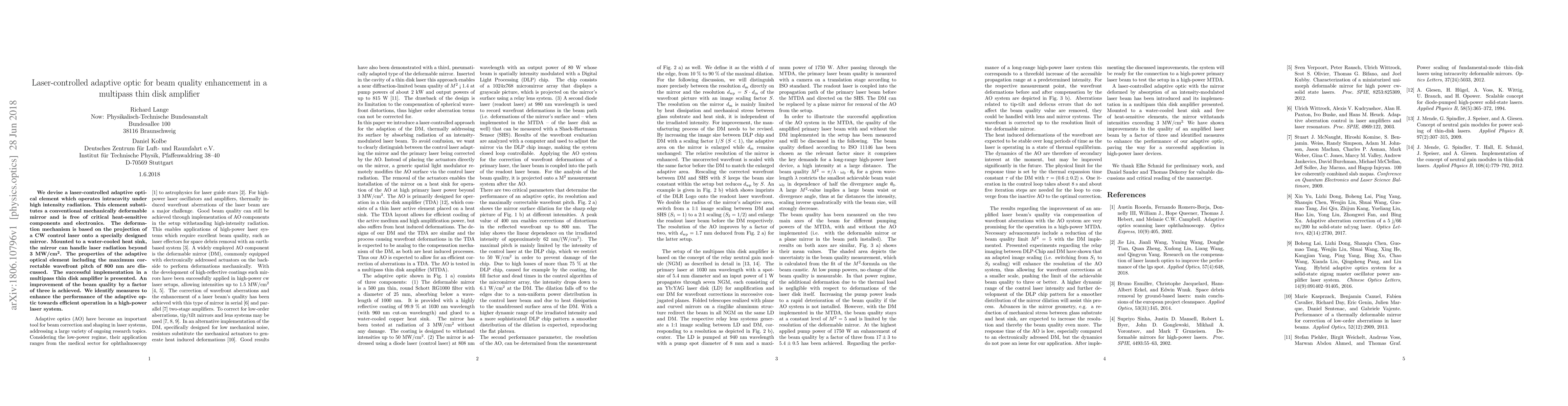 We devise a laser-controlled adaptive optical element which operates intracavity under high intensity radiation. This element substitutes a conventional mechanically deformable mirror and is free of critical heat-sensitive components and electronics. The deformation mechanism is based on the projection of a CW control laser onto a specially designed mirror. Mounted to a water-cooled heat sink, the mirror can handle laser radiation beyond 3 MW/cm^2. The properties of the adaptive optical element including the maximum correctable wavefront pitch of 800 nm are discussed. The successful implementation in a multipass thin disk amplifier is presented. An improvement of the beam quality by a factor of three is achieved. We identify measures to enhance the performance of the adaptive optic towards efficient operation in a high-power laser system.