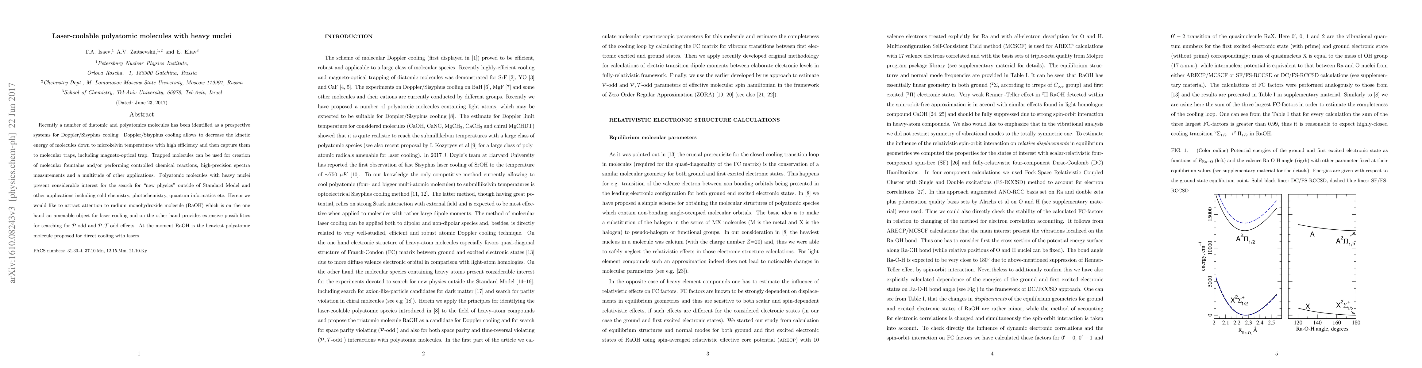 Recently a number of diatomic and polyatomics molecules has been identified as a prospective systems for Doppler/Sisyphus cooling. Doppler/Sisyphus cooling allows to decrease the kinetic energy of molecules down to microkelvin temperatures with high efficiency and then capture them to molecular traps, including magneto-optical trap. Trapped molecules can be used for creation of molecular fountains and/or performing controlled chemical reactions, high-precision spectra measurements and a multitude of other applications. Polyatomic molecules with heavy nuclei present considerable interest for the search for "new physics" outside of Standard Model and other applications including cold chemistry, photochemistry, quantum informatics etc. Herein we would like to attract attention to radium monohydroxide molecule (RaOH) which is on the one hand an amenable object for laser cooling and on the other hand provides extensive possibilities for searching for P-odd and P,T-odd effects. At the moment RaOH is the heaviest polyatomic molecule proposed for direct cooling with lasers.