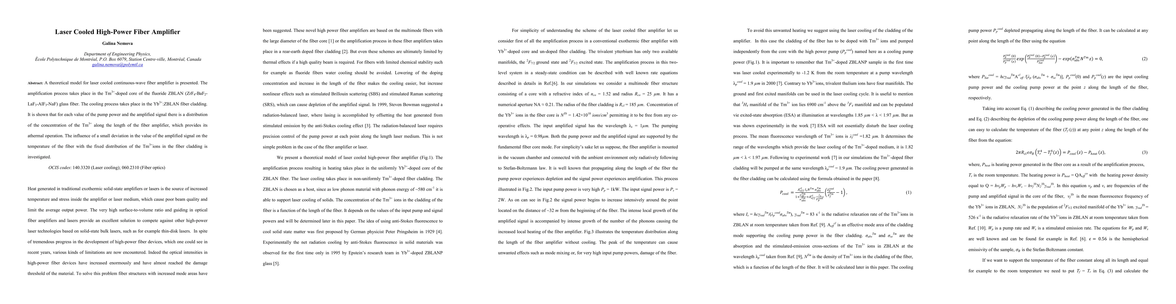 This paper presents a theoretical model for a laser-cooled continuous-wave fiber amplifier using Tm3+-doped fluoride ZBLAN glass, with Yb3+ in the cladding for cooling. It demonstrates athermal operation through a distribution of Tm3+ concentration along the fiber, and investigates the impact of signal variations on fiber temperature.
