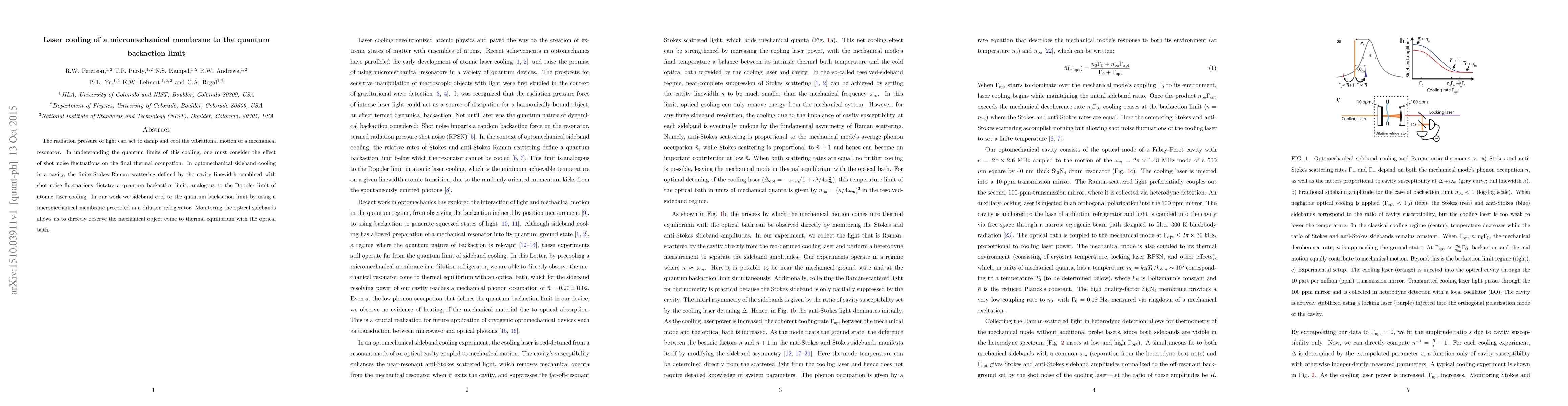 The radiation pressure of light can act to damp and cool the vibrational motion of a mechanical resonator. In understanding the quantum limits of this cooling, one must consider the effect of shot noise fluctuations on the final thermal occupation. In optomechanical sideband cooling in a cavity, the finite Stokes Raman scattering defined by the cavity linewidth combined with shot noise fluctuations dictates a quantum backaction limit, analogous to the Doppler limit of atomic laser cooling. In our work we sideband cool to the quantum backaction limit by using a micromechanical membrane precooled in a dilution refrigerator. Monitoring the optical sidebands allows us to directly observe the mechanical object come to thermal equilibrium with the optical bath.