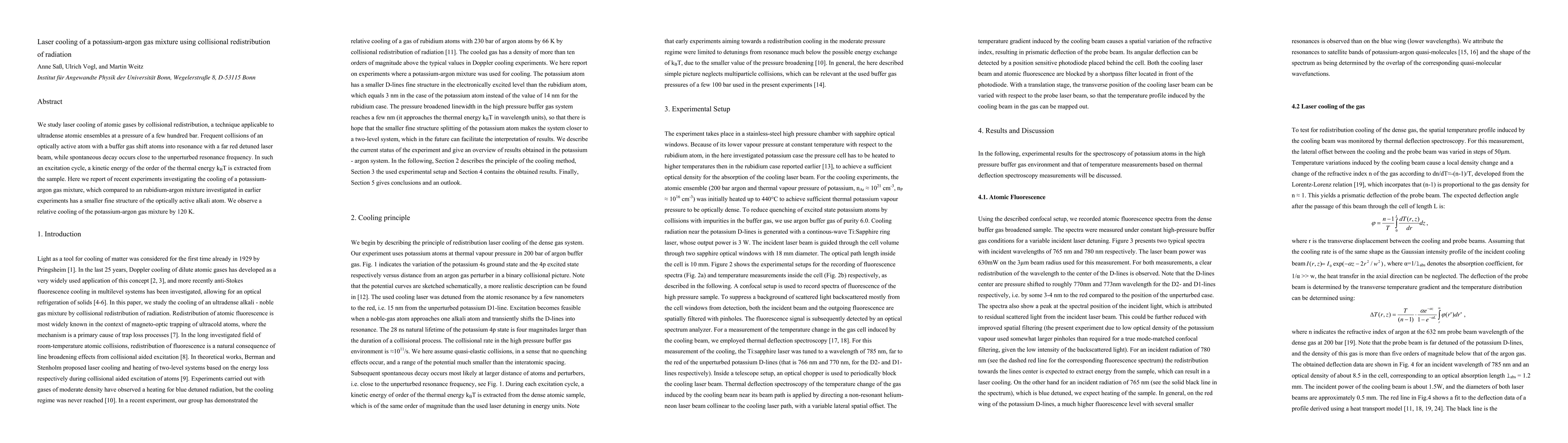 We study laser cooling of atomic gases by collisional redistribution, a technique applicable to ultradense atomic ensembles at a pressure of a few hundred bar. Frequent collisions of an optically active atom with a buffer gas shift atoms into resonance with a far red detuned laser beam, while spontaneous decay occurs close to the unperturbed resonance frequency. In such an excitation cycle, a kinetic energy of the order of the thermal energy kT is extracted from the sample. Here we report of recent experiments investigating the cooling of a potassium-argon gas mixture, which compared to an rubidium-argon mixture investigated in earlier experiments has a smaller fine structure of the optically active alkali atom. We observe a relative cooling of the potassium-argon gas mixture by 120 K.
