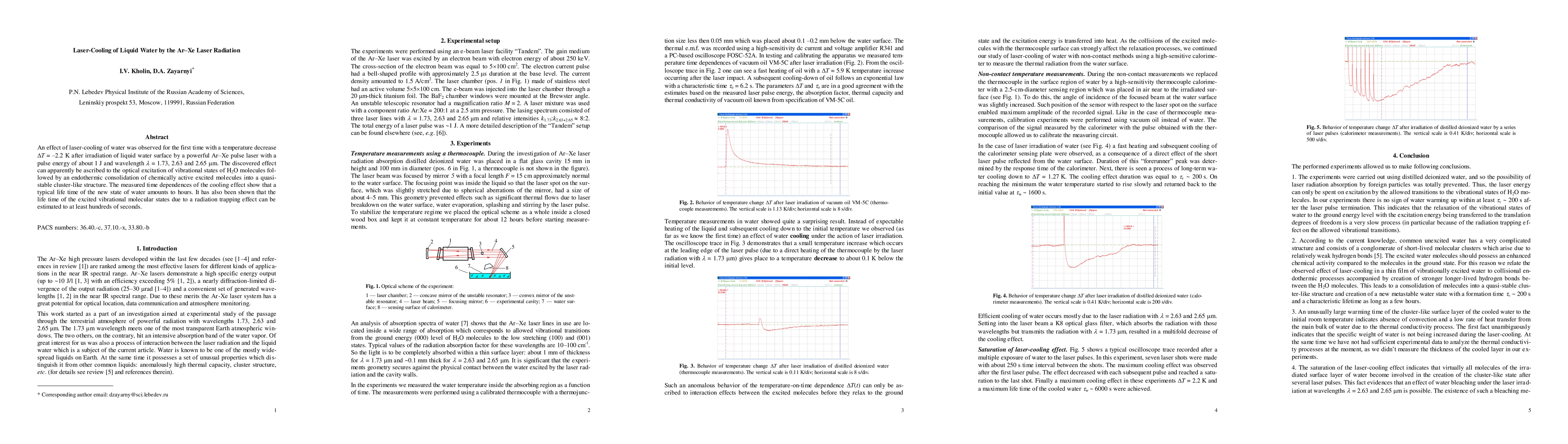 This study reports the first observation of laser-cooling of liquid water using Ar-Xe laser radiation, achieving a temperature reduction of -2.2 K. The cooling effect is attributed to the optical excitation of H2O molecules, leading to the formation of a quasi-stable cluster-like structure, with the excited states lasting for hours.