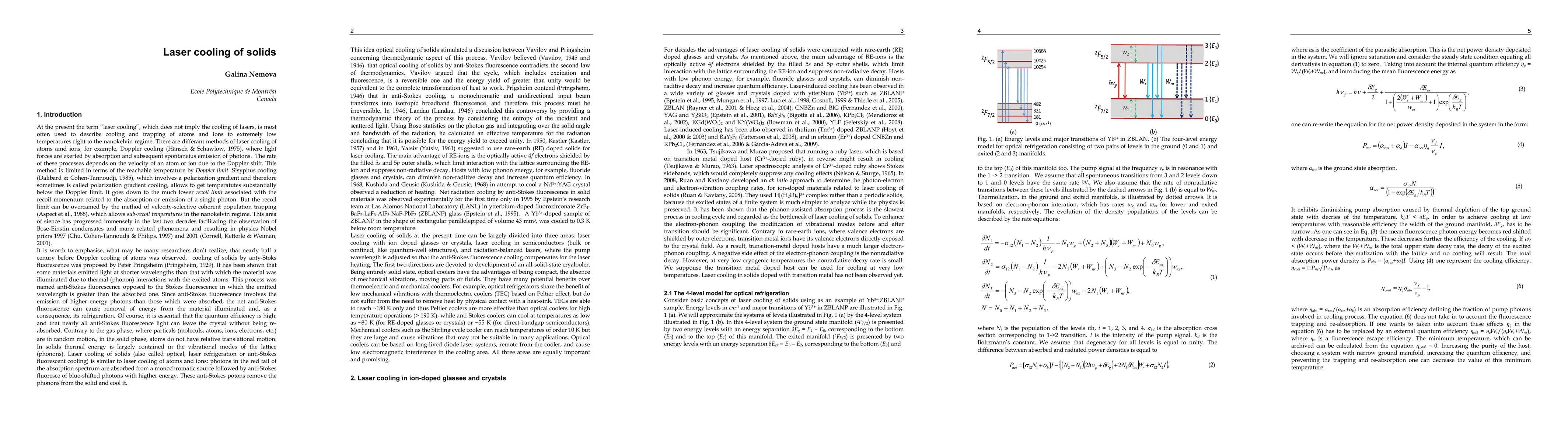 This paper discusses recent advancements in laser cooling of solids, comparing it to the well-established laser cooling of atoms and ions. It highlights three major areas of laser cooling in solids: ion doped glasses or crystals, semiconductors, and radiation-balanced lasers, emphasizing their potential and importance.