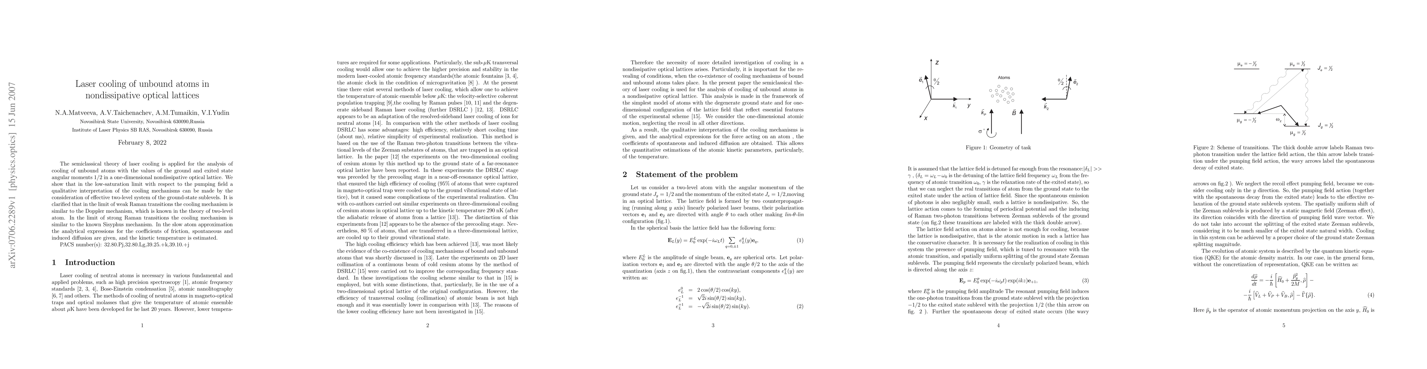 The semiclassical theory of laser cooling is applied for the analysis of cooling of unbound atoms with the values of the ground and exited state angular moments 1/2 in a one-dimensional nondissipative optical lattice. We show that in the low-saturation limit with respect to the pumping field a qualitative interpretation of the cooling mechanisms can be made by the consideration of effective two-level system of the ground-state sublevels. It is clarified that in the limit of weak Raman transitions the cooling mechanism is similar to the Doppler mechanism, which is known in the theory of two-level atom. In the limit of strong Raman transitions the cooling mechanism is similar to the known Sisyphus mechanism. In the slow atom approximation the analytical expressions for the coefficients of friction, spontaneous and induced diffusion are given, and the kinetic temperature is estimated.