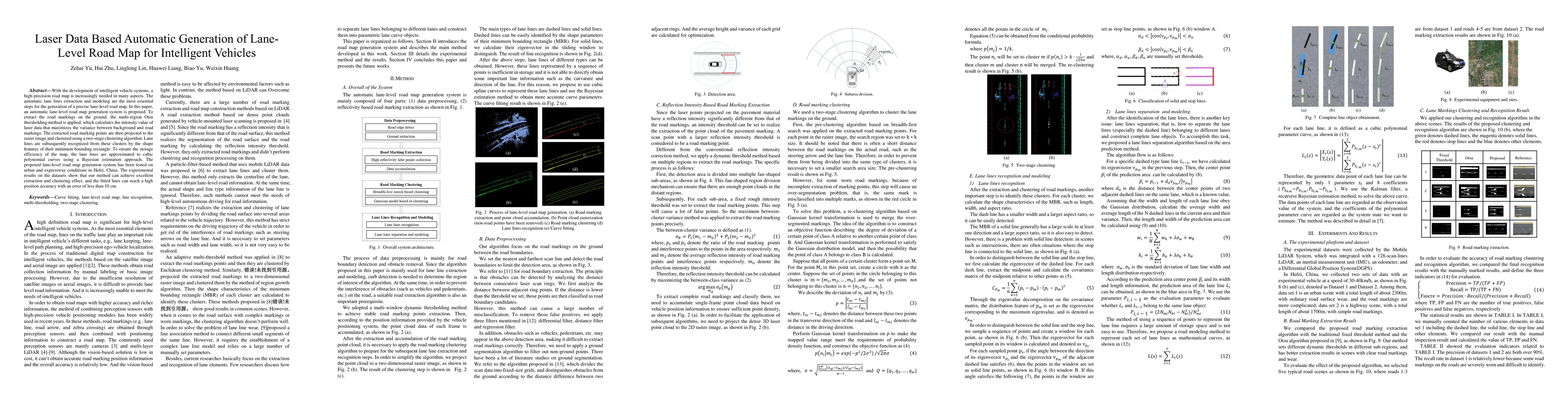 This paper proposes an automatic system for generating lane-level road maps using laser data, employing multi-region Otsu thresholding for road marking extraction and a two-stage clustering algorithm for lane line recognition. The method achieves high position accuracy with an error of less than 10 cm, validated in urban and expressway conditions in Hefei, China.