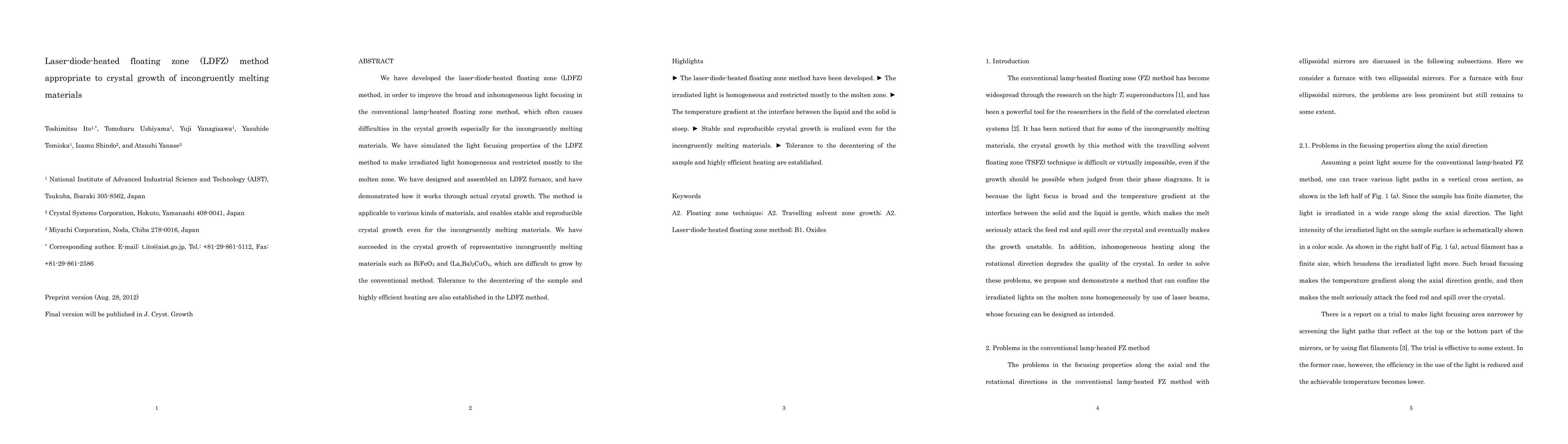 The laser-diode-heated floating zone (LDFZ) method has been developed to enhance light focusing for crystal growth of incongruently melting materials, achieving homogeneous and restricted light irradiation. This method successfully enables stable and reproducible crystal growth for materials like BiFeO3 and (La,Ba)2CuO4, which are challenging with conventional methods.