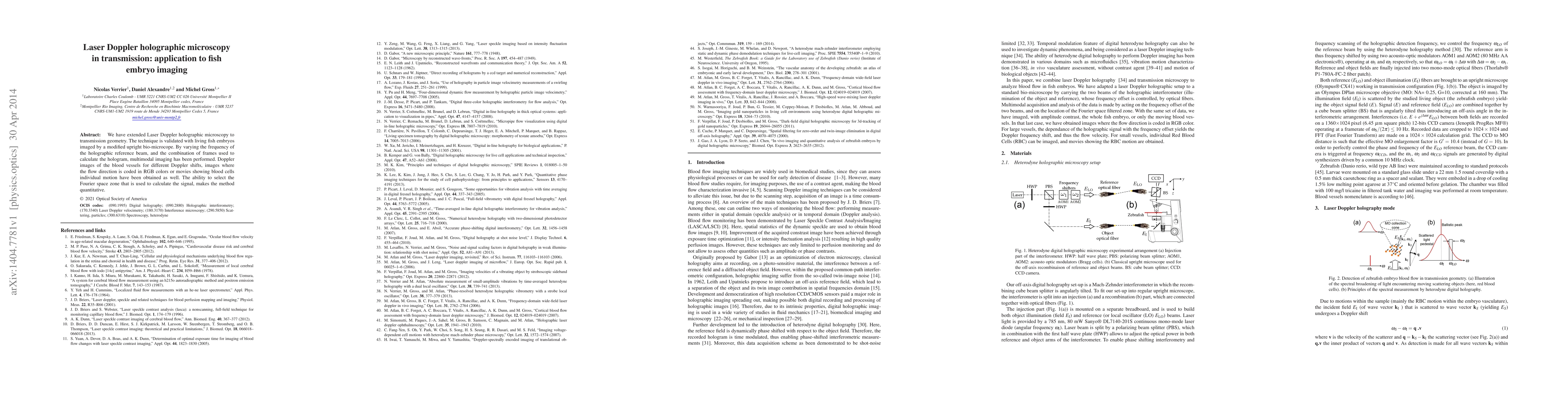 This paper extends Laser Doppler holographic microscopy to transmission mode, validated through imaging of living fish embryos. The technique enables multimodal imaging, including Doppler images, RGB-coded flow direction, and movies of blood cell motion, with quantitative analysis via selective Fourier space zones.