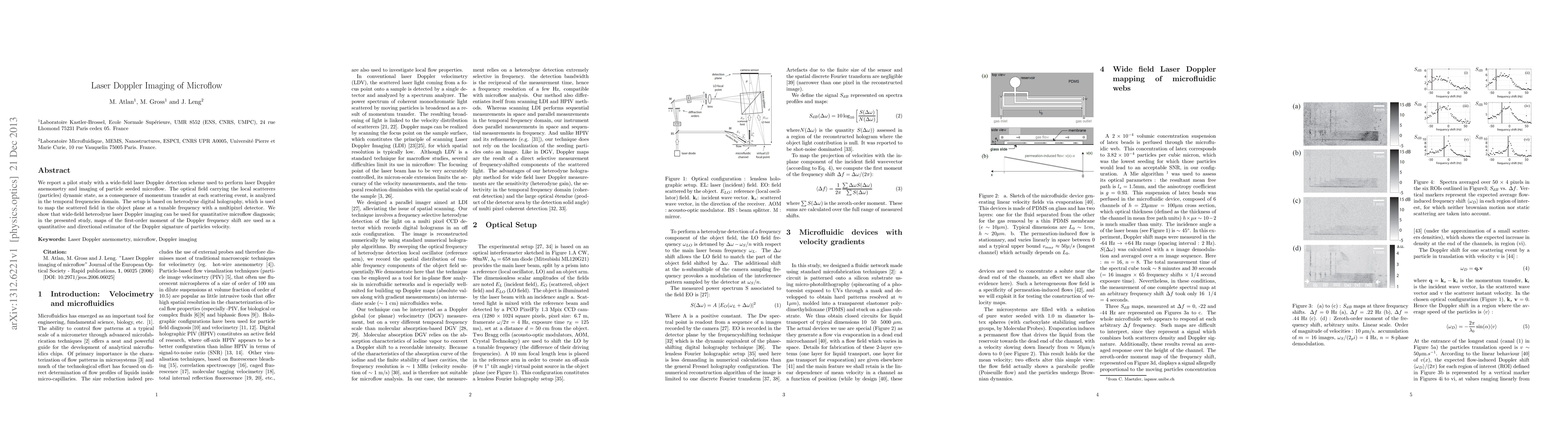 We report a pilot study with a wide-field laser Doppler detection scheme used to perform laser Doppler anemometry and imaging of particle seeded microflow. The optical field carrying the local scatterers (particles) dynamic state, as a consequence of momentum transfer at each scattering event, is analyzed in the temporal frequencies domain. The setup is based on heterodyne digital holography, which is used to map the scattered field in the object plane at a tunable frequency with a multipixel detector. We show that wide-field heterodyne laser Doppler imaging can be used for quantitative microflow diagnosis; in the presented study, maps of the first-order moment of the Doppler frequency shift are used as a quantitative and directional estimator of the Doppler signature of particles velocity.