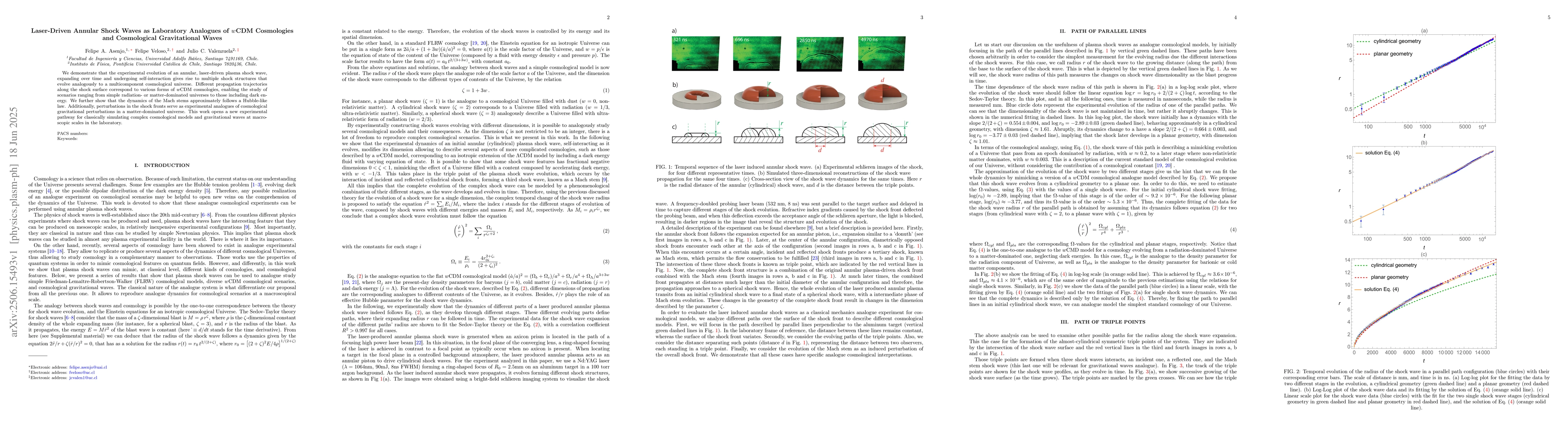 We demonstrate that the experimental evolution of an annular, laser-driven plasma shock wave, expanding over time and undergoing self-interaction gives rise to multiple shock structures that evolve analogously to a multicomponent cosmological universe. Different propagation trajectories along the shock surface correspond to various forms of $w$CDM cosmologies, enabling the study of scenarios ranging from simple radiation- or matter-dominated universes to those including dark energy. We further show that the dynamics of the Mach stems approximately follows a Hubble-like law. Additionally, perturbations in the shock fronts serve as experimental analogues of cosmological gravitational perturbations in a matter-dominated universe. This work opens a new experimental pathway for classically simulating complex cosmological models and gravitational waves at macroscopic scales in the laboratory.