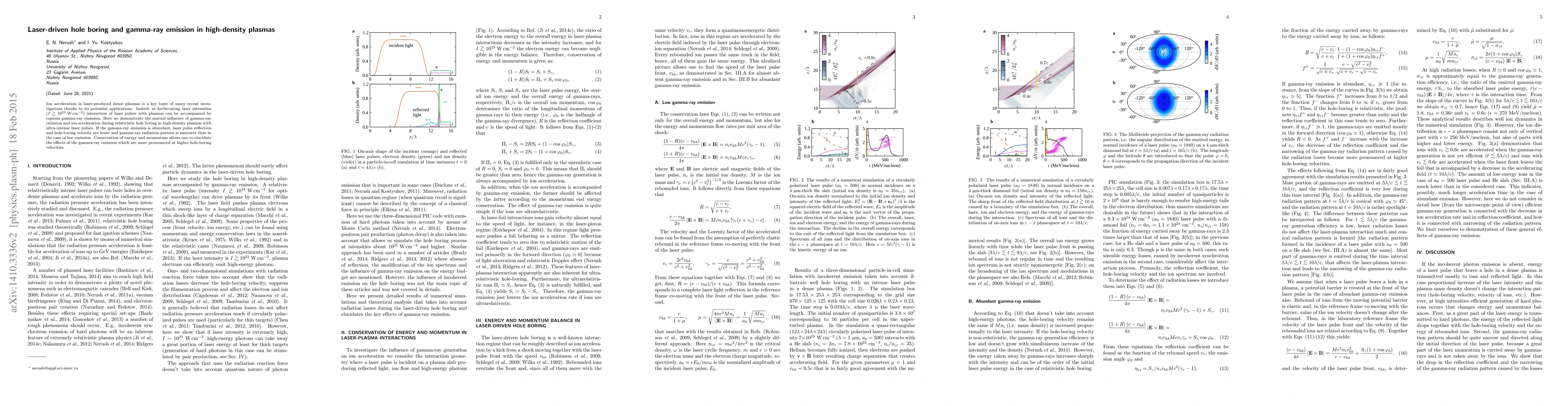 This paper investigates the interaction of ultra-intense laser pulses with high-density plasmas, focusing on the mutual influence of gamma-ray emission and ion acceleration during relativistic hole boring. The study finds that abundant gamma-ray emission reduces laser pulse reflection and hole-boring velocity, while also narrowing the gamma-ray radiation pattern.