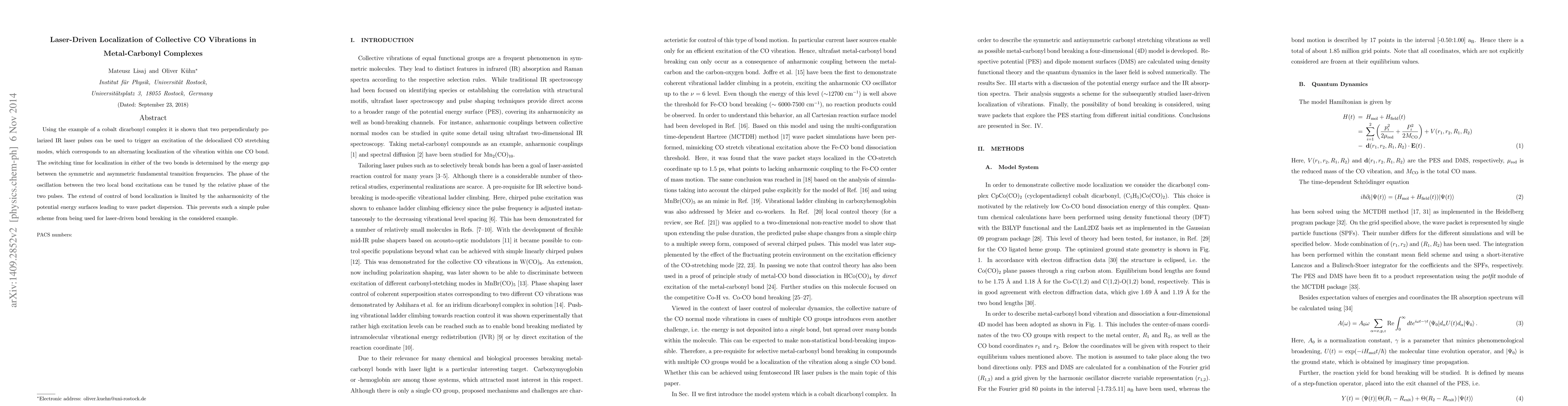 Using the example of a cobalt dicarbonyl complex it is shown that two perpendicularly polarized IR laser pulses can be used to trigger an excitation of the delocalized CO stretching modes, which corresponds to an alternating localization of the vibration within one CO bond. The switching time for localization in either of the two bonds is determined by the energy gap between the symmetric and asymmetric fundamental transition frequencies. The phase of the oscillation between the two local bond excitations can be tuned by the relative phase of the two pulses. The extend of control of bond localization is limited by the anharmonicity of the potential energy surfaces leading to wave packet dispersion. This prevents such a simple pulse scheme from being used for laser-driven bond breaking in the considered example.