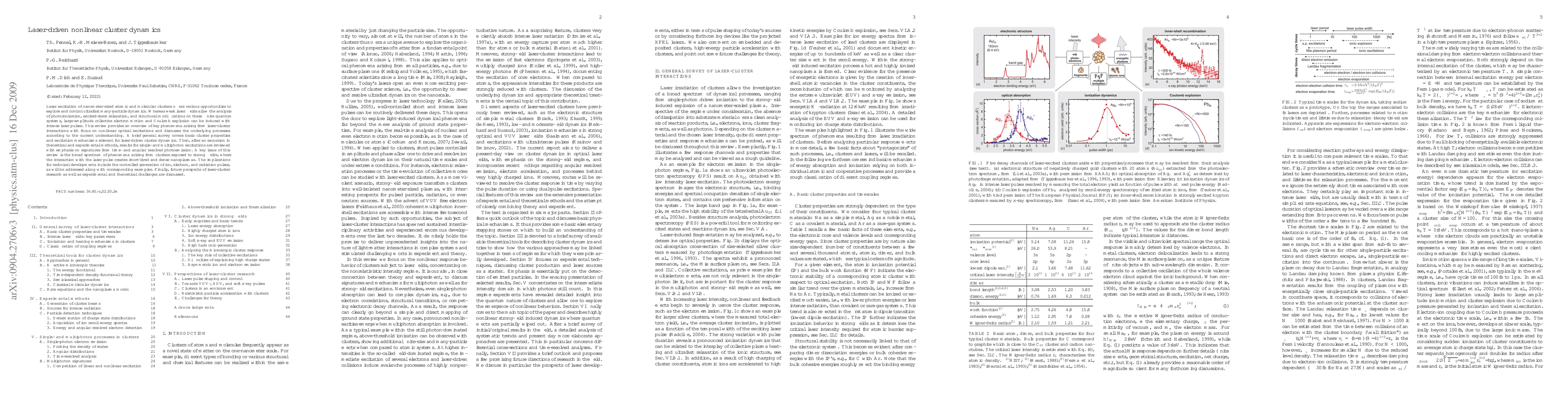 Laser excitation of nanometer-sized atomic and molecular clusters offers various opportunities to explore and control ultrafast many-particle dynamics. Whereas weak laser fields allow the analysis of photoionization, excited-state relaxation, and structural modifications on these finite quantum systems, large-amplitude collective electron motion and Coulomb explosion can be induced with intense laser pulses. This review provides an overview of key phenomena arising from laser-cluster interactions with focus on nonlinear optical excitations and discusses the underlying processes according to the current understanding. A brief general survey covers basic cluster properties and excitation mechanisms relevant for laser-driven cluster dynamics. Then, after an excursion in theoretical and experimental methods, results for single- and multiphoton excitations are reviewed with emphasis on signatures from time- and angular resolved photoemission. A key issue of this review is the broad spectrum of phenomena arising from clusters exposed to strong fields, where the interaction with the laser pulse creates short-lived and dense nanoplasmas. The implications for technical developments include the controlled generation of ion, electron, and radiation pulses, as will be addressed along with corresponding examples. Finally, future prospects of laser-cluster research as well as experimental and theoretical challenges are discussed.