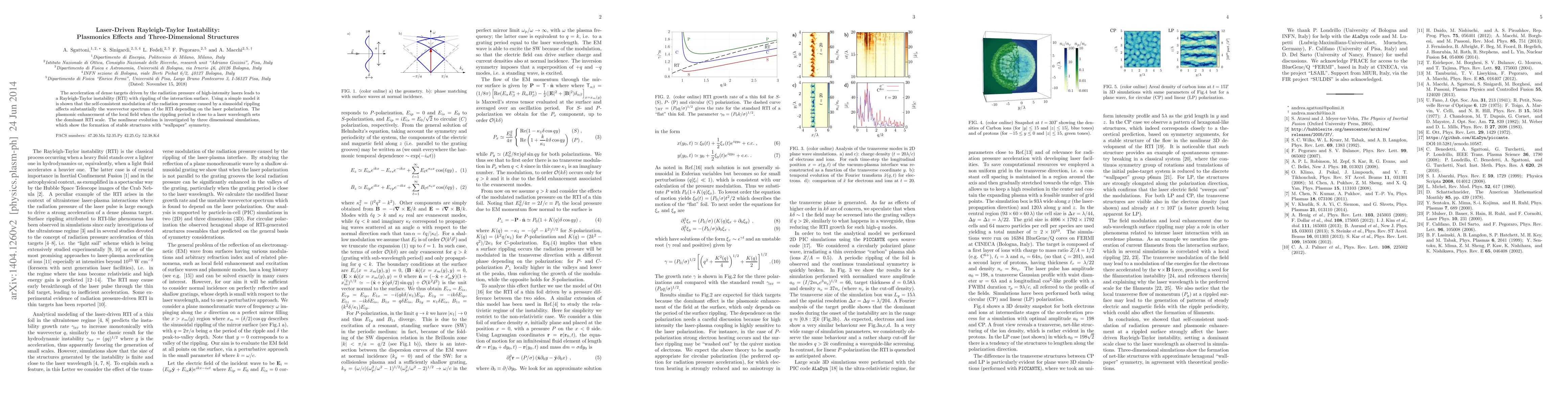 This paper investigates the laser-driven Rayleigh-Taylor instability (RTI) in dense targets, demonstrating how modulation of radiation pressure due to rippling affects the RTI wavevector spectrum based on laser polarization. Plasmonics effects enhance local fields, determining the dominant RTI scale when rippling period matches laser wavelength, leading to stable three-dimensional "wallpaper" structures.
