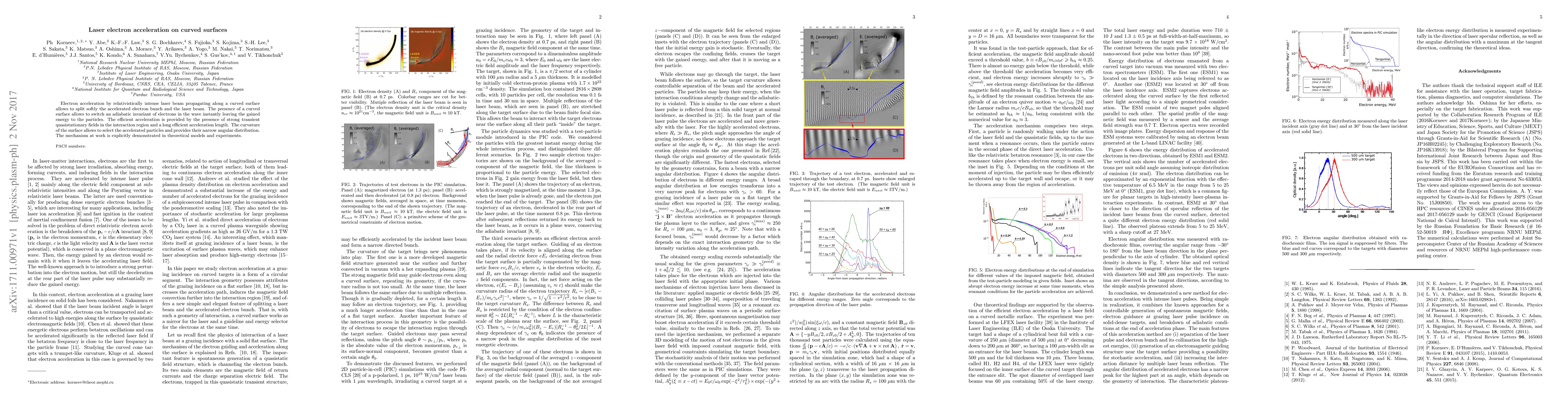 Electron acceleration by relativistically intense laser beam propagating along a curved surface allows to split softly the accelerated electron bunch and the laser beam. The presence of a curved surface allows to switch an adiabatic invariant of electrons in the wave instantly leaving the gained energy to the particles. The efficient acceleration is provided by the presence of strong transient quasistationary fields in the interaction region and a long efficient acceleration length. The curvature of the surface allows to select the accelerated particles and provides their narrow angular distribution. The mechanism at work is explicitly demonstrated in theoretical models and experiments.