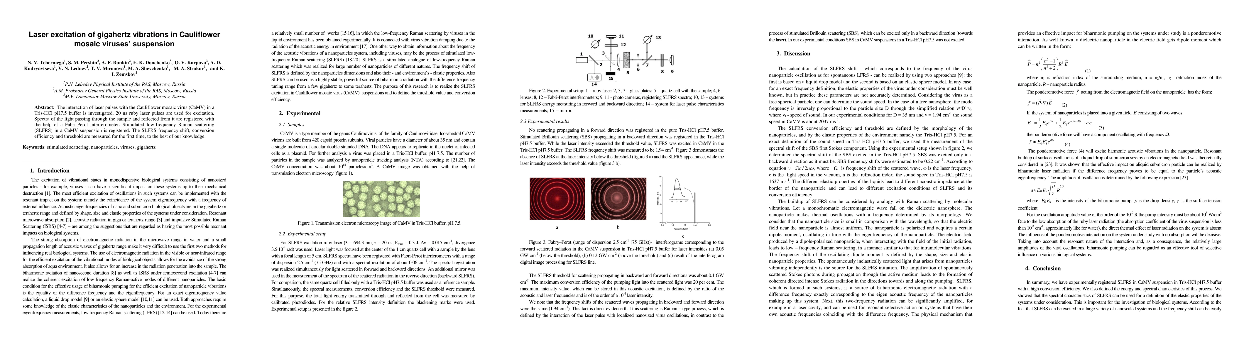 This study investigates the interaction of 20 ns ruby laser pulses with Cauliflower mosaic virus (CaMV) suspensions, revealing stimulated low-frequency Raman scattering (SLFRS). For the first time, the SLFRS frequency shift, conversion efficiency, and threshold are measured.