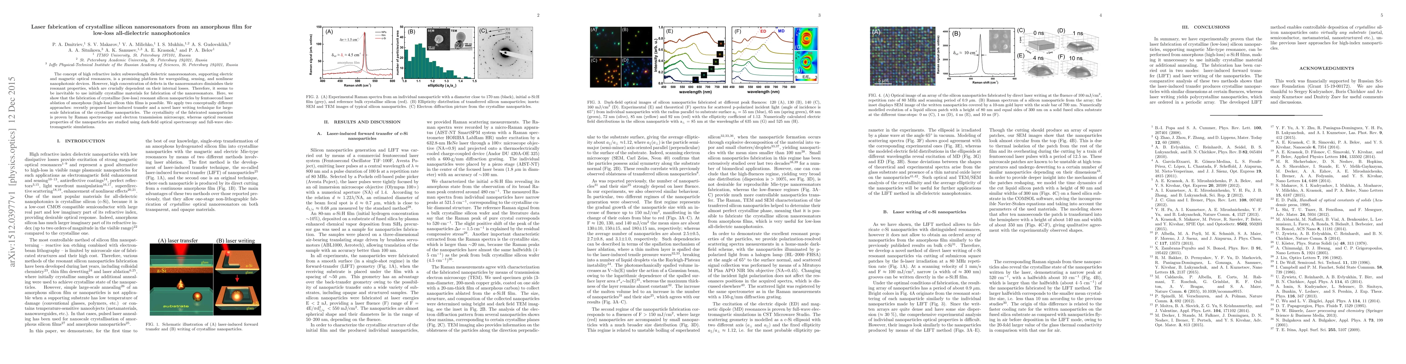 This paper demonstrates the laser fabrication of low-loss crystalline silicon nanoresonators from amorphous silicon films, employing femtosecond laser ablation. The study validates the crystallinity and optical properties of the fabricated nanoparticles using Raman spectroscopy, electron microscopy, and optical spectroscopy, showcasing their potential for advanced nanophotonic applications.