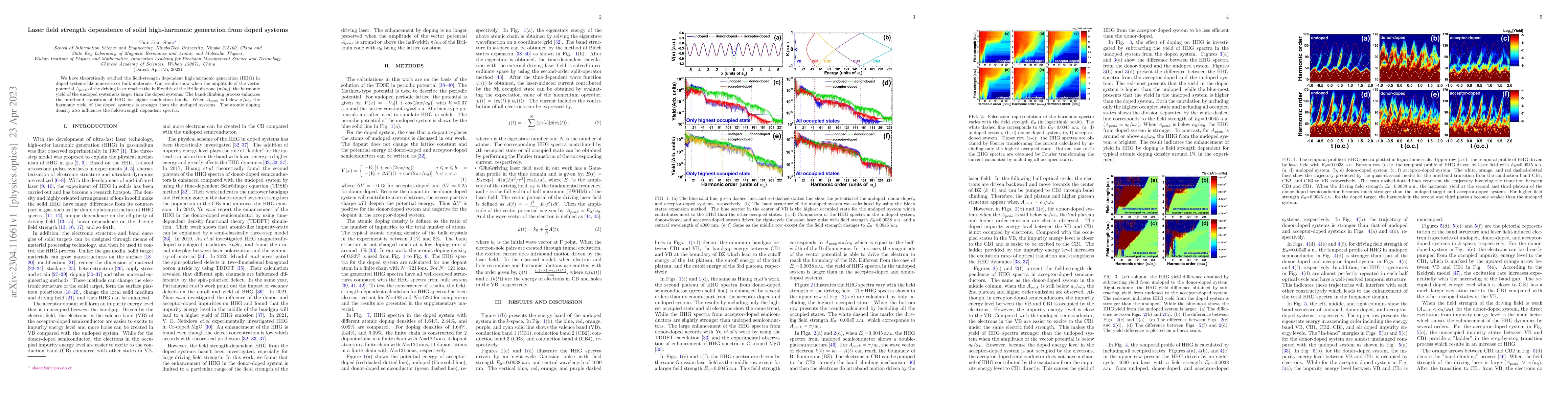 We have theoretically studied the field-strength dependent high-harmonic generation (HHG) in doped systems like nano-size or bulk materials. Our results show when the amplitude of the vector potential A_peak of the driving laser reaches the half-width of the Brillouin zone ({\pi}/a0), the harmonic yield of the undoped systems is larger than the doped systems. The band-climbing process enhances the interband transition of HHG for higher conduction bands. When A_peak is below {\pi}/a0 , the harmonic yield of the doped systems is stronger than the undoped systems. The atomic doping density also influences the field-strength dependent spectra.