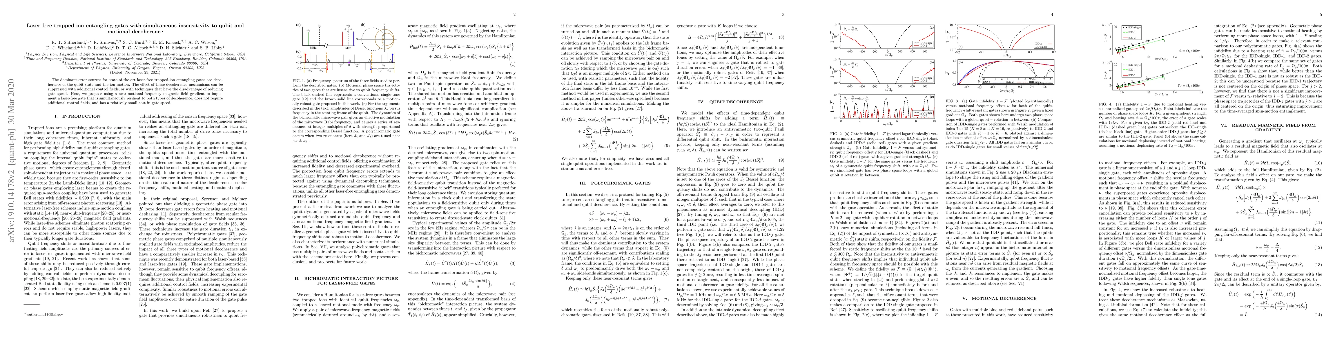 This paper proposes a laser-free trapped-ion entangling gate using a near-motional-frequency magnetic field gradient to simultaneously suppress qubit and motional decoherence without requiring additional control fields, maintaining a relatively small reduction in gate speed.