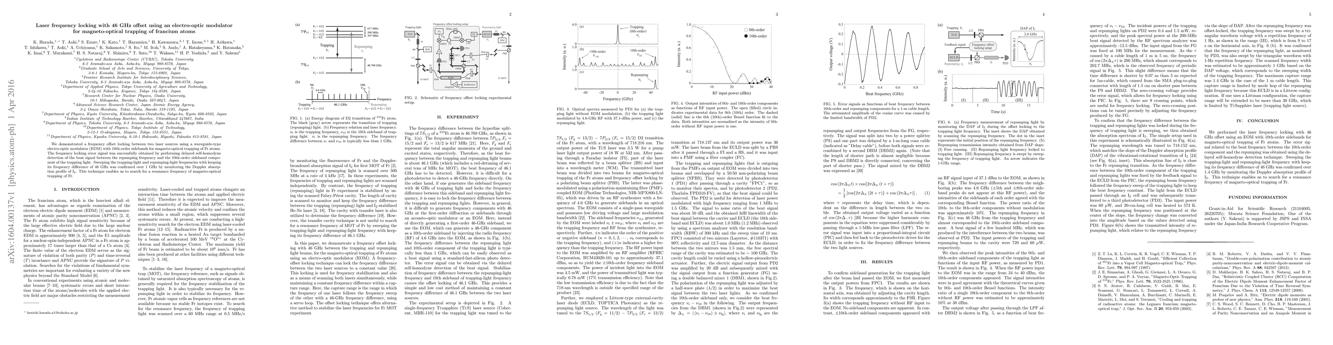 This paper demonstrates laser frequency locking with a 46 GHz offset using an electro-optic modulator for trapping francium atoms, achieving stable frequency differences over 1 GHz. The technique employs delayed self-homodyne detection and enables precise magneto-optical trapping resonance frequency searches.