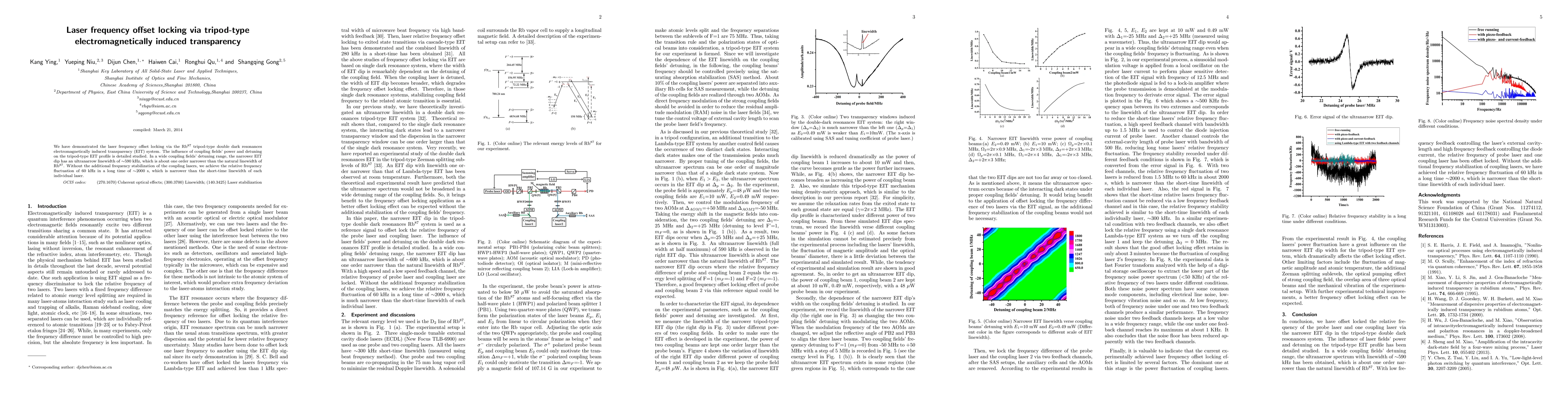 This paper demonstrates laser frequency offset locking using a tripod-type electromagnetically induced transparency (EIT) system in Rb. The study shows an ultranarrow linewidth of 590 KHz within a wide detuning range, achieving relative frequency stability of 60 KHz over 2000 seconds without additional coupling laser stabilization.