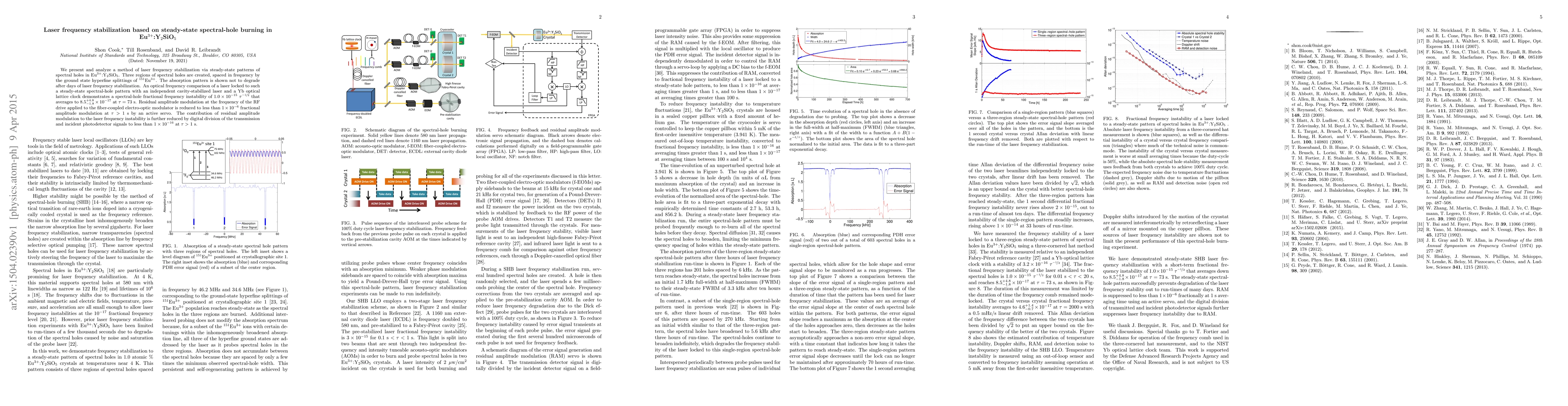 This paper details a laser frequency stabilization technique using steady-state spectral-hole burning in Eu$^{3+}$:Y$_2$SiO$_5$, achieving a fractional frequency instability of $1.0\times10^{-15}~ \tau^{-\frac{1}{2}}$, averaging to $8.5\times10^{-17}$ at $\tau = 73$ s, with active servo and digital signal processing reducing residual amplitude modulation to below $1\times10^{-16}$.