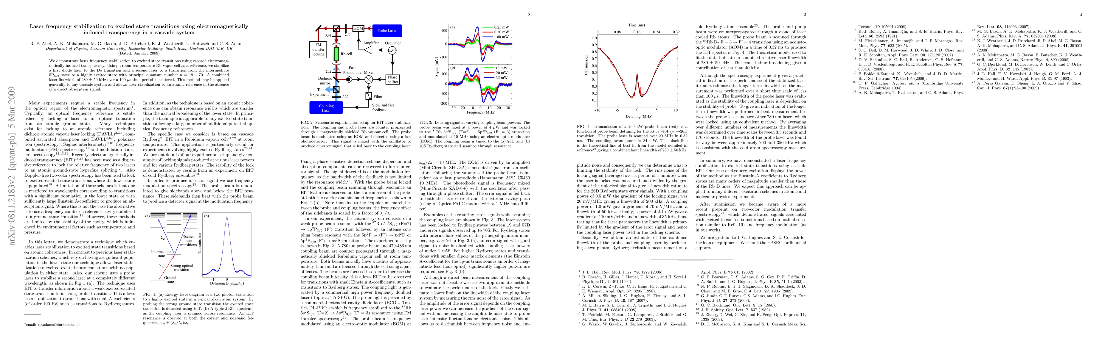 This paper demonstrates laser frequency stabilization to highly excited state transitions using cascade electromagnetically induced transparency (EIT) in a Rb vapor cell. A combined laser linewidth of 280 kHz is achieved, showcasing a method applicable to any cascade system for atomic reference stabilization.