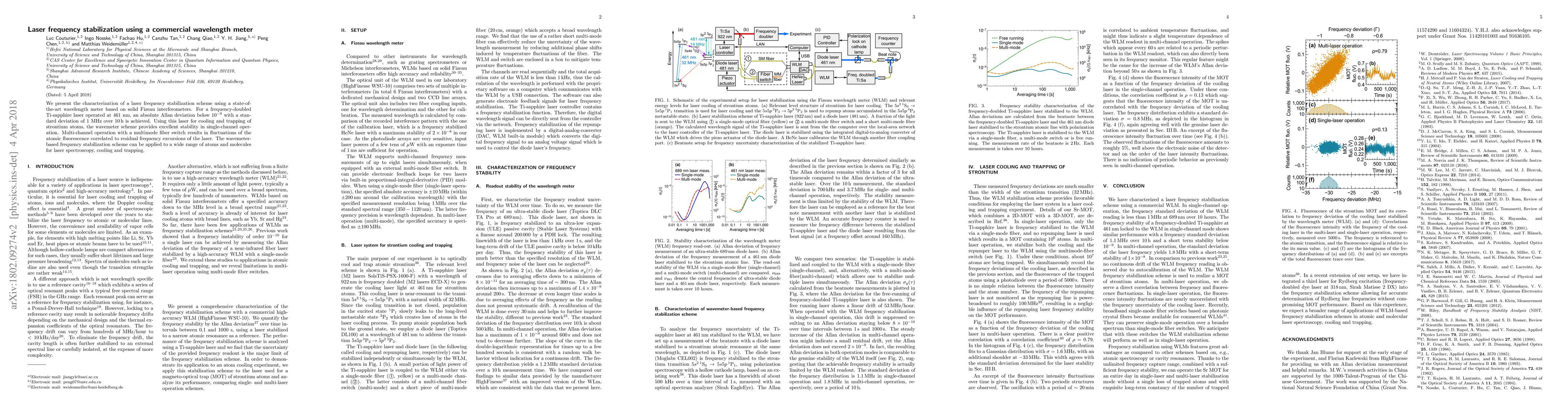 We present the characterization of a laser frequency stabilization scheme using a state-of-the-art wavelength meter based on solid Fizeau interferometers. For a frequency-doubled Ti-sapphire laser operated at 461 nm, an absolute Allan deviation below $10^{-9}$ with a standard deviation of $1$ MHz over 10\,h is achieved. Using this laser for cooling and trapping of strontium atoms, the wavemeter scheme provides excellent stability in single-channel operation. Multi-channel operation with a multimode fiber switch results in fluctuations of the atomic fluorescence correlated to residual frequency excursions of the laser. The wavemeter-based frequency stabilization scheme can be applied to a wide range of atoms and molecules for laser spectroscopy, cooling and trapping.