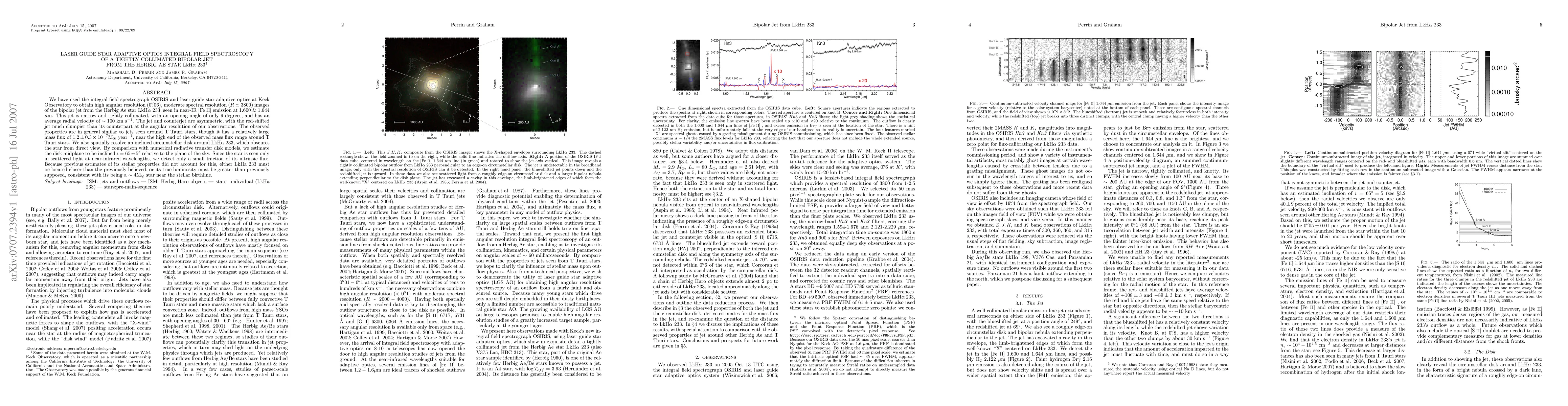 We have used the integral field spectrograph OSIRIS and laser guide star adaptive optics at Keck Observatory to obtain high angular resolution (0.06"), moderate spectral resolution (R ~ 3800) images of the bipolar jet from the Herbig Ae star LkHa 233, seen in near-IR [Fe II] emission at 1.600 & 1.644 microns. This jet is narrow and tightly collimated, with an opening angle of only 9 degrees, and has an average radial velocity of ~ 100 km/s. The jet and counterjet are asymmetric, with the red-shifted jet much clumpier than its counterpart at the angular resolution of our observations. The observed properties are in general similar to jets seen around T Tauri stars, though it has a relatively large mass flux of (1.2e-7 +- 0.3e-7) M_sun/year, near the high end of the observed mass flux range around T Tauri stars. We also spatially resolve an inclined circumstellar disk around LkHa 233, which obscures the star from direct view. By comparison with numerical radiative transfer disk models, we estimate the disk midplane to be inclined i = 65 +- 5 degrees relative to the plane of the sky. Since the star is seen only in scattered light at near-infrared wavelengths, we detect only a small fraction of its intrinsic flux. Because previous estimates of its stellar properties did not account for this, either LkHa 233 must be located closer than the previously believed, or its true luminosity must be greater than previously supposed, consistent with its being a ~4 M_sun star near the stellar birthline.