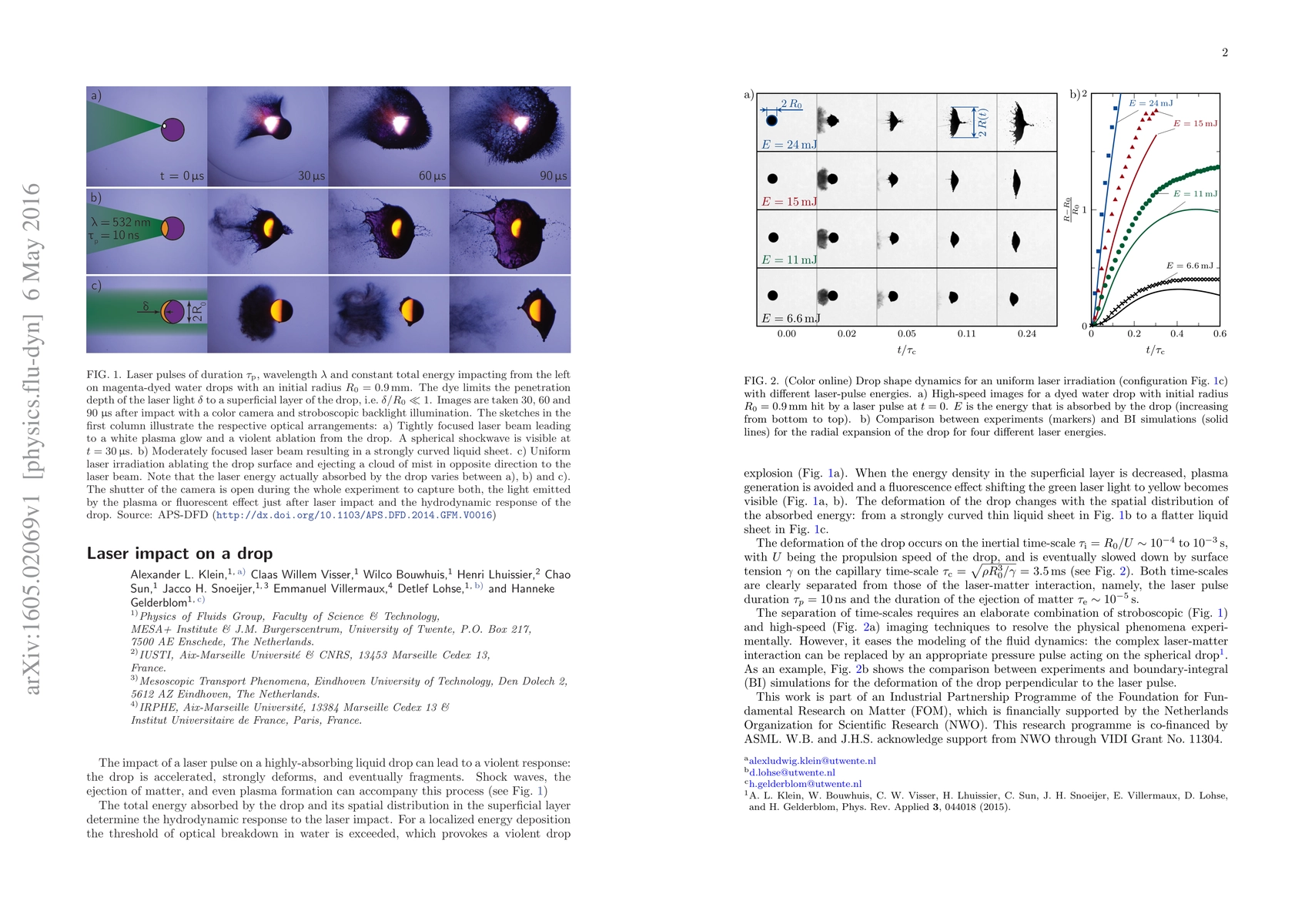 The impact of a laser pulse on a highly absorbing liquid drop can lead to a violent response: the drop is accelerated, strongly deforms, and eventually fragments. Shock waves, the ejection of matter, and even plasma formation can accompany this process ...