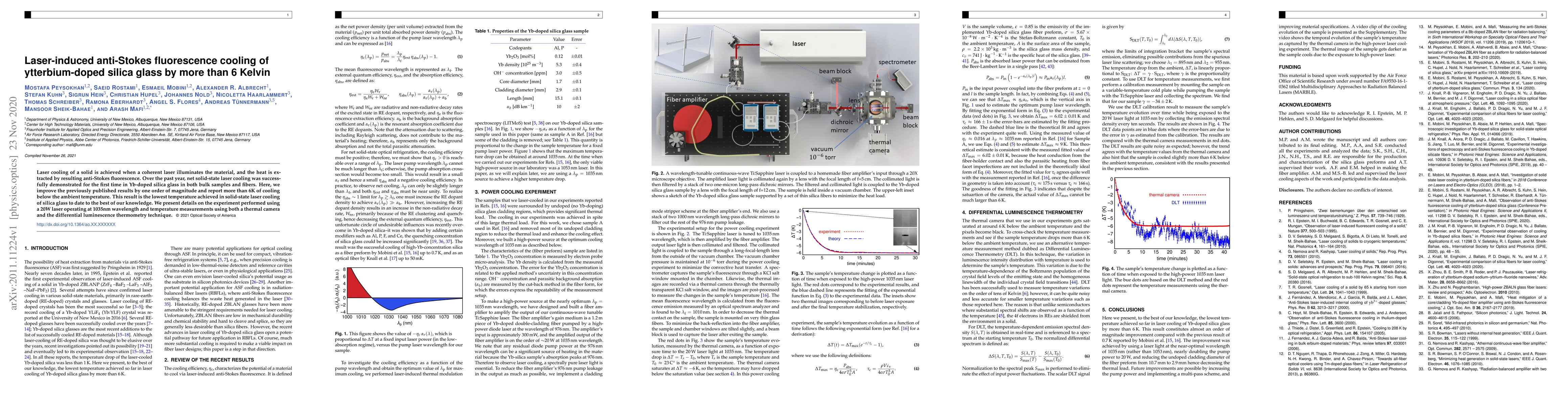 This paper reports a significant advancement in solid-state laser cooling of ytterbium-doped silica glass, achieving a net cooling of more than 6 Kelvin below ambient temperature, which is the lowest temperature achieved to date. The experiment utilized a 20W laser at 1035nm and employed thermal camera and differential luminescence thermometry for temperature measurements.